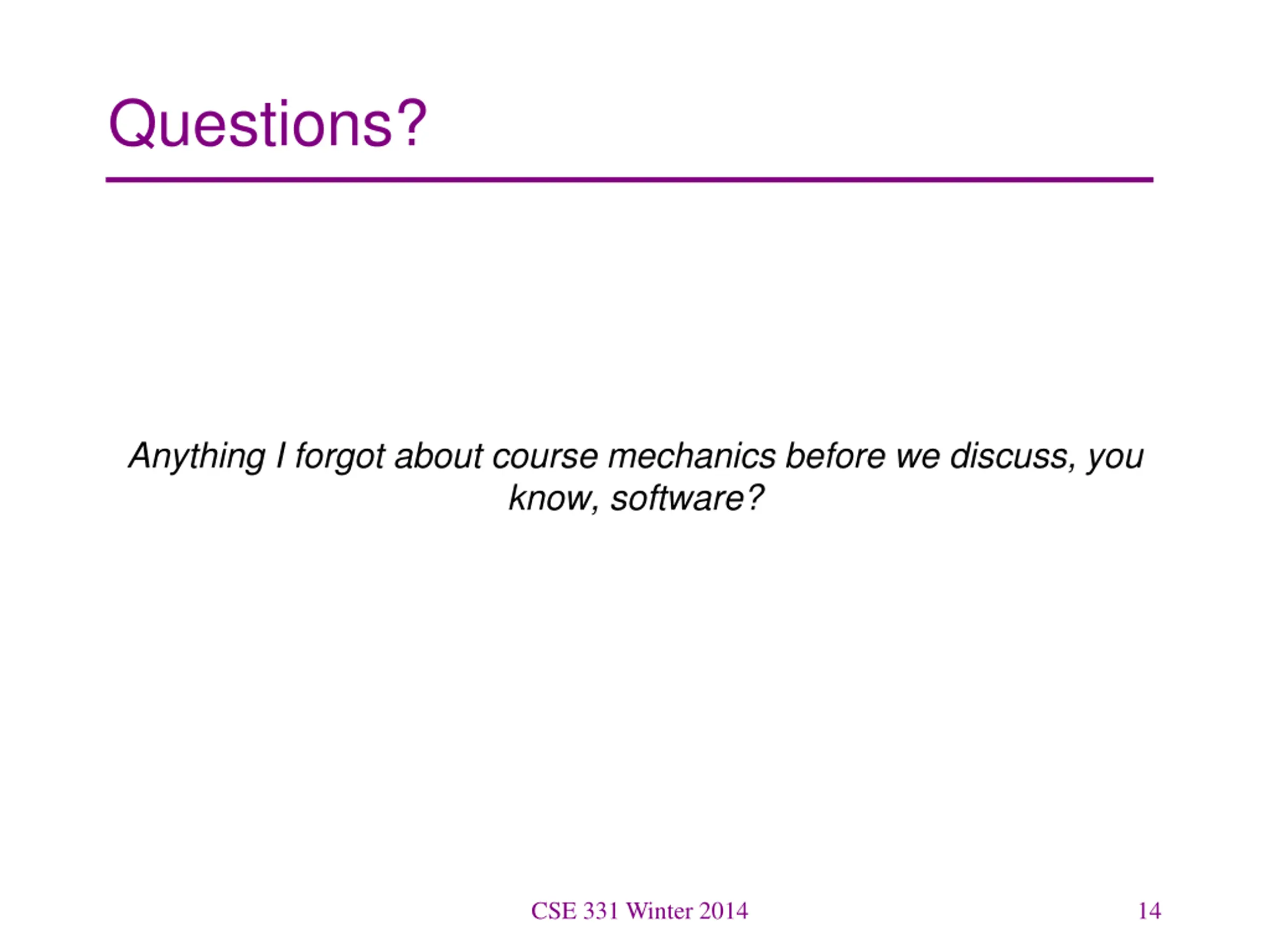 Questions? Anything I forgot about course mechanics before we discuss, you know, software? CSE 331 Winter 2014 14