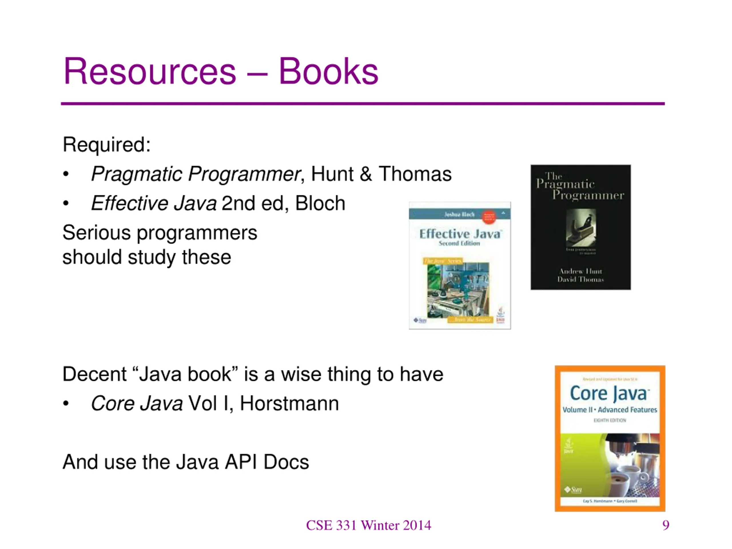 Resources Books Required: Pragmatic Programmer, Hunt & Thomas Effective Java 2nd ed, Bloch Serious programmers should study these Decent Java book is a wise thing to have Core Java Vol I, Horstmann And use the Java API Docs CSE 331 Winter 2014 9