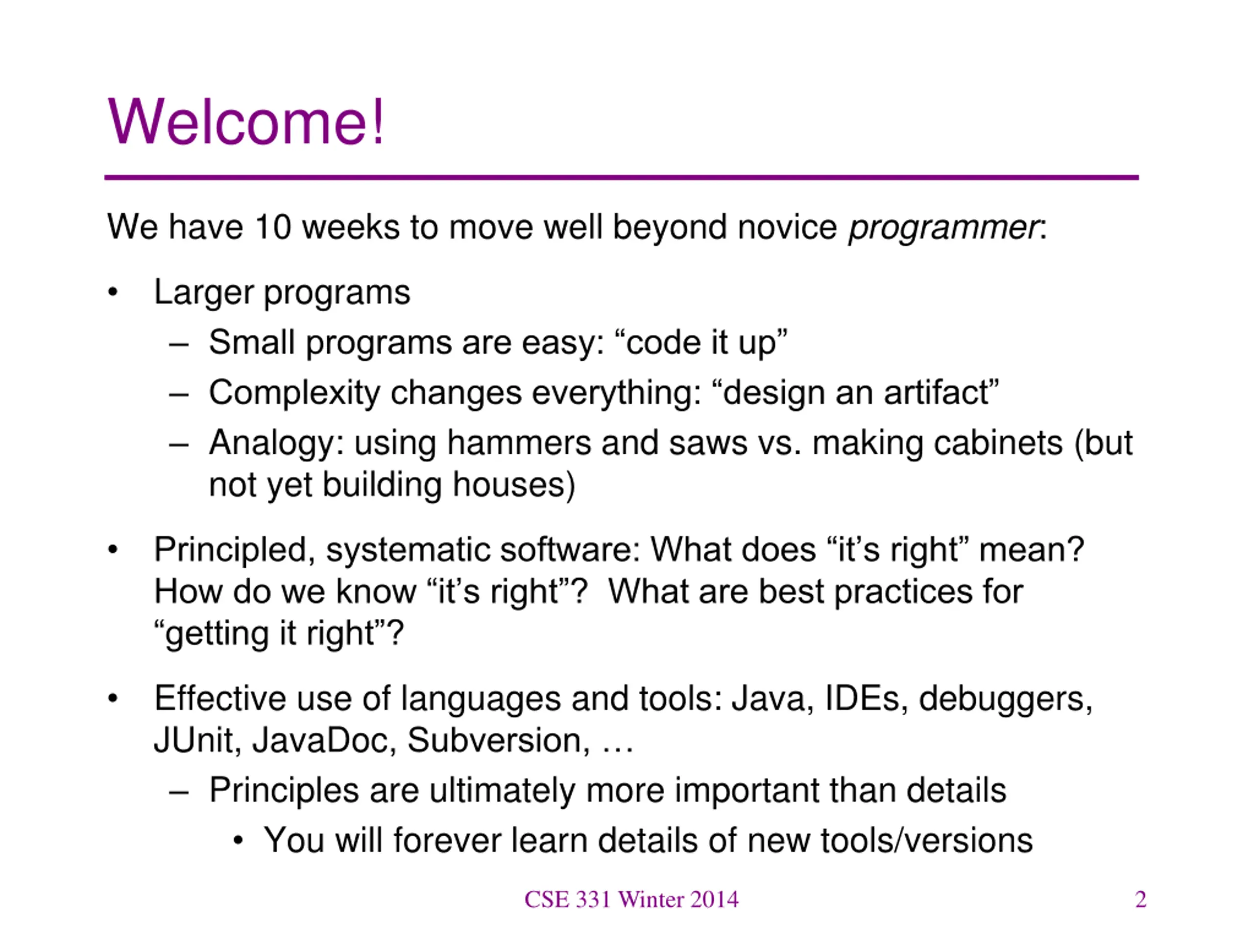Welcome! We have 10 weeks to move well beyond novice programmer: Larger programs Small programs are easy: code it up Complexity changes everything: design an artifact Analogy: using hammers and saws vs. making cabinets (but not yet building houses) Principled, systematic software: What does it s right mean? How do we know it s right ? What are best practices for getting it right ? Effective use of languages and tools: Java, IDEs, debuggers, JUnit, JavaDoc, Subversion, Principles are ultimately more important than details You will forever learn details of new tools/versions CSE 331 Winter 2014 2