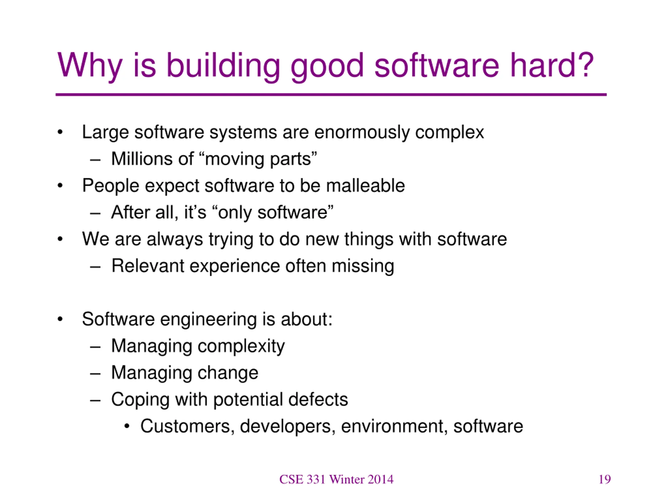 Why is building good software hard? Large software systems are enormously complex Millions of moving parts People expect software to be malleable After all, it s only software We are always trying to do new things with software Relevant experience often missing Software engineering is about: Managing complexity Managing change Coping with potential defects Customers, developers, environment, software CSE 331 Winter 2014 19