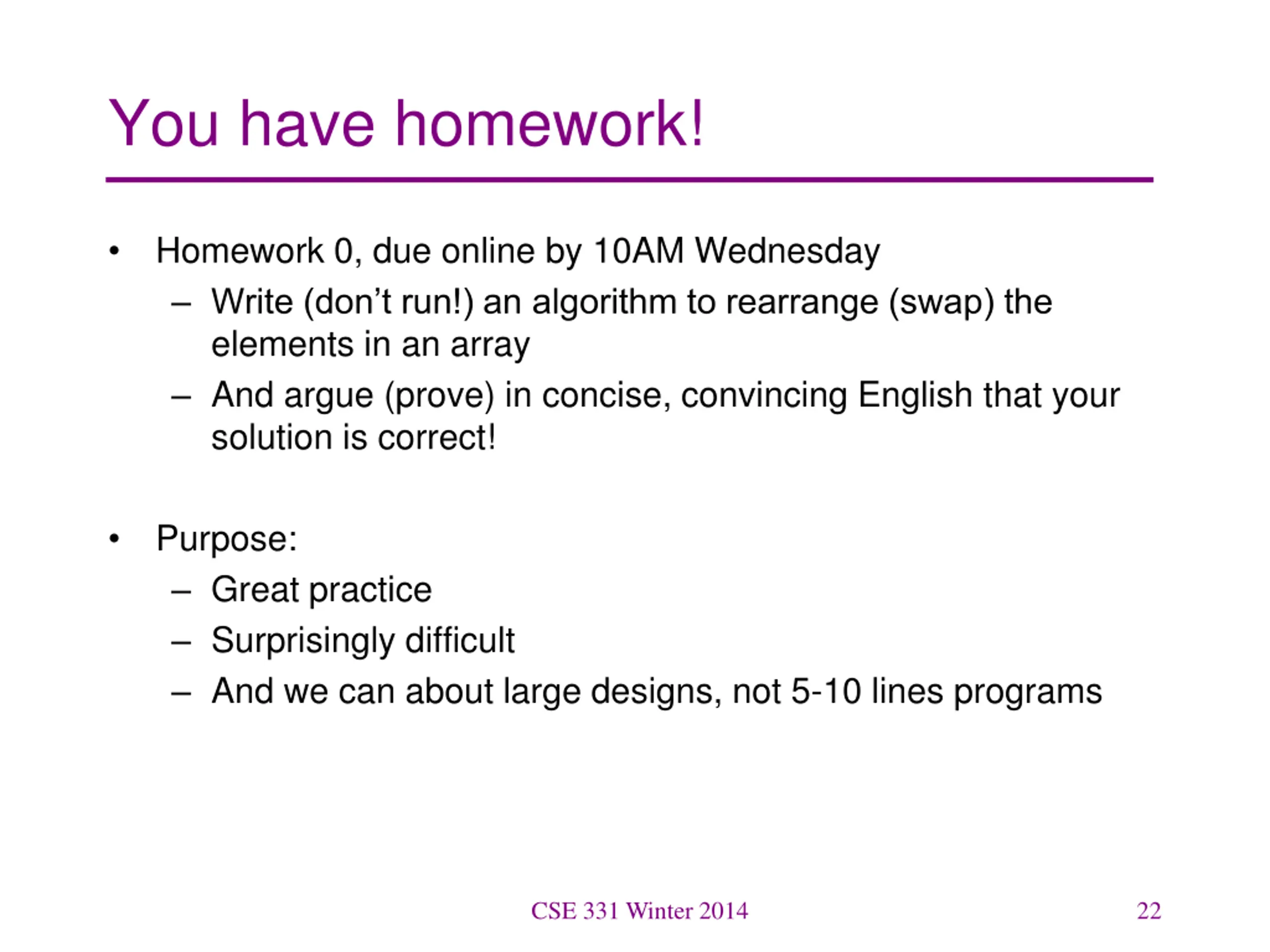 You have homework! Homework 0, due online by 10AM Wednesday Write (don t run!) an algorithm to rearrange (swap) the elements in an array And argue (prove) in concise, convincing English that your solution is correct! Purpose: Great practice Surprisingly difficult And we can about large designs, not 5-10 lines programs CSE 331 Winter 2014 22