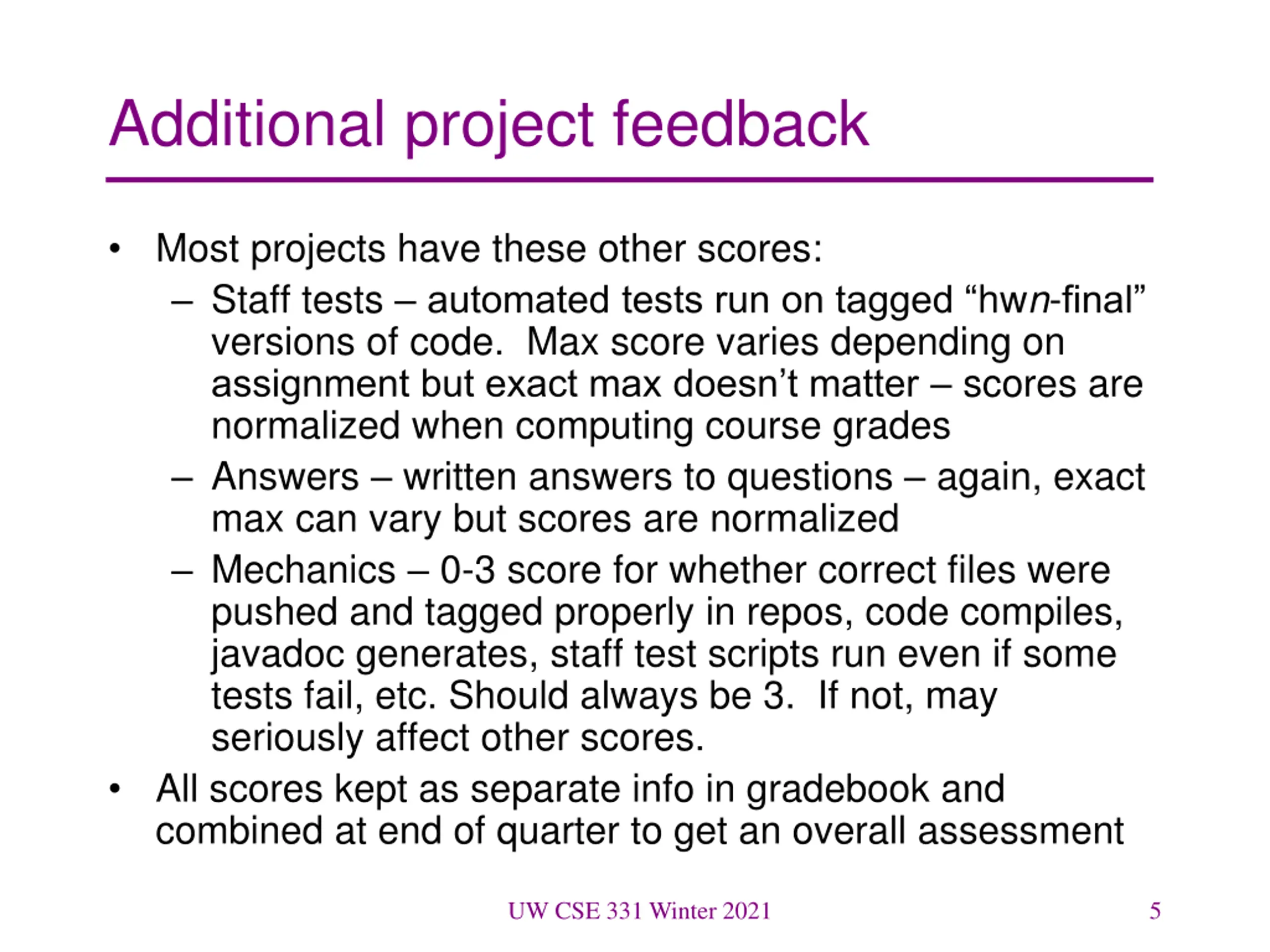 Basic grading scale For each major category, a single 0-3 score (much like a work or code review, not like intro programming) 3 = very good / superior, no major issues, easy / pleasant to read, probably a few fairly minor things to improve / fix up 2 = generally good but some non-trivial major, or too many minor, problems 1 = significant problems, needs major work 0 = not credible, cannot grade, etc. Expect scores to be a mix of 2 s and 3 s, with more 2 s earlier in the quarter and more 3 s as things improve with practice UW CSE 331 Winter 2021 4