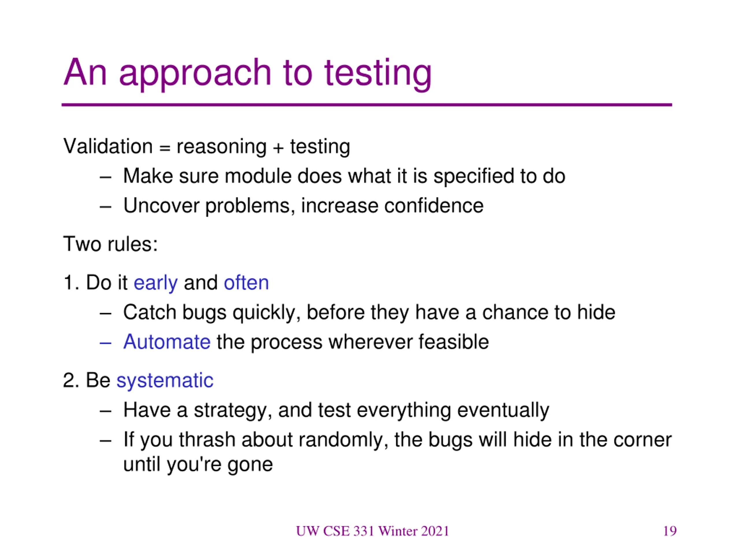 An approach to testing Validation = reasoning + testing Make sure module does what it is specified to do Uncover problems, increase confidence Two rules: 1. Do it early and often Catch bugs quickly, before they have a chance to hide Automate the process wherever feasible 2. Be systematic Have a strategy, and test everything eventually If you thrash about randomly, the bugs will hide in the corner until you're gone UW CSE 331 Winter 2021 19