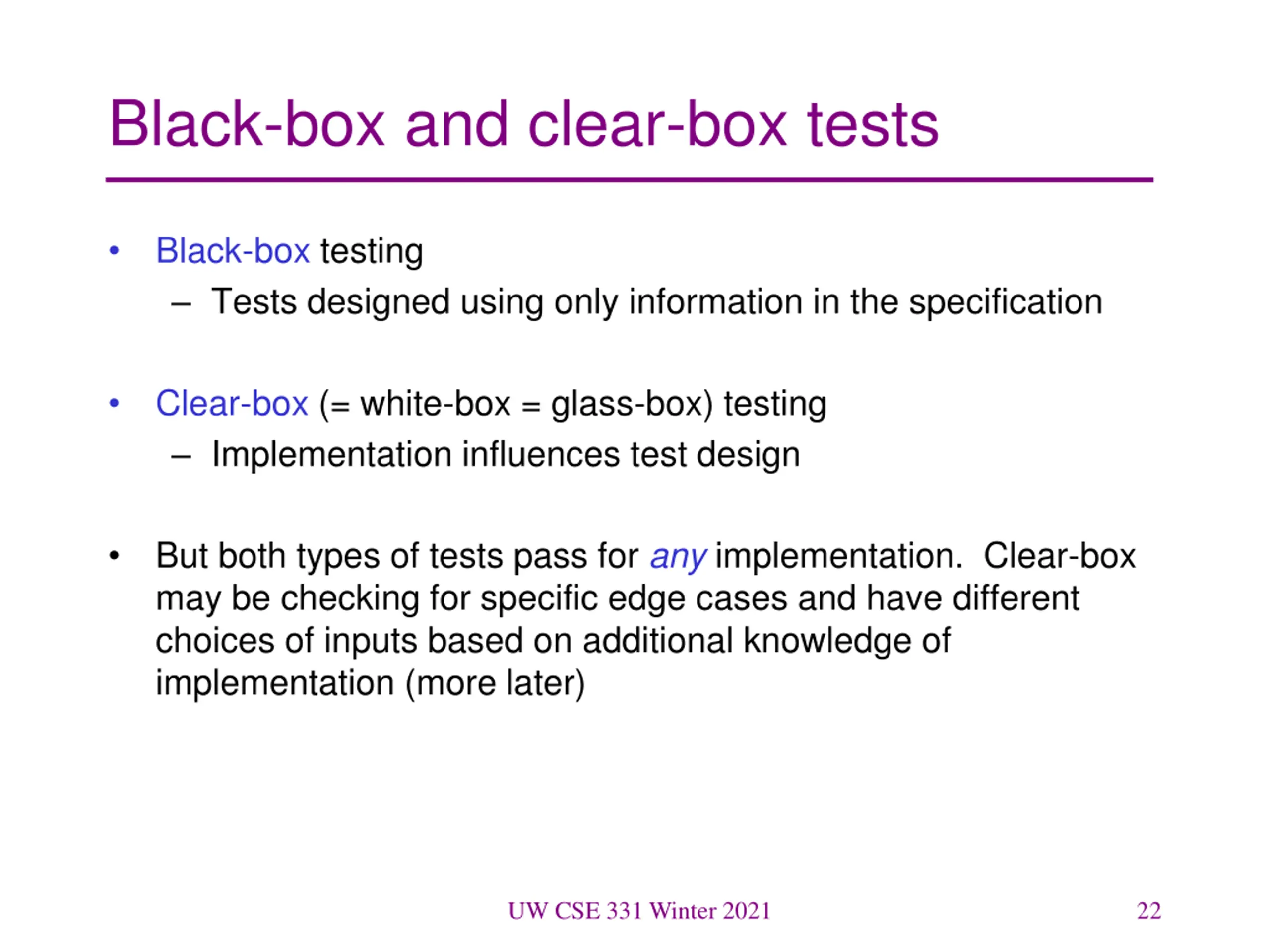 Black-box and clear-box tests Black-box testing Tests designed using only information in the specification Clear-box (= white-box = glass-box) testing Implementation influences test design But both types of tests pass for any implementation. Clear-box may be checking for specific edge cases and have different choices of inputs based on additional knowledge of implementation (more later) UW CSE 331 Winter 2021 22