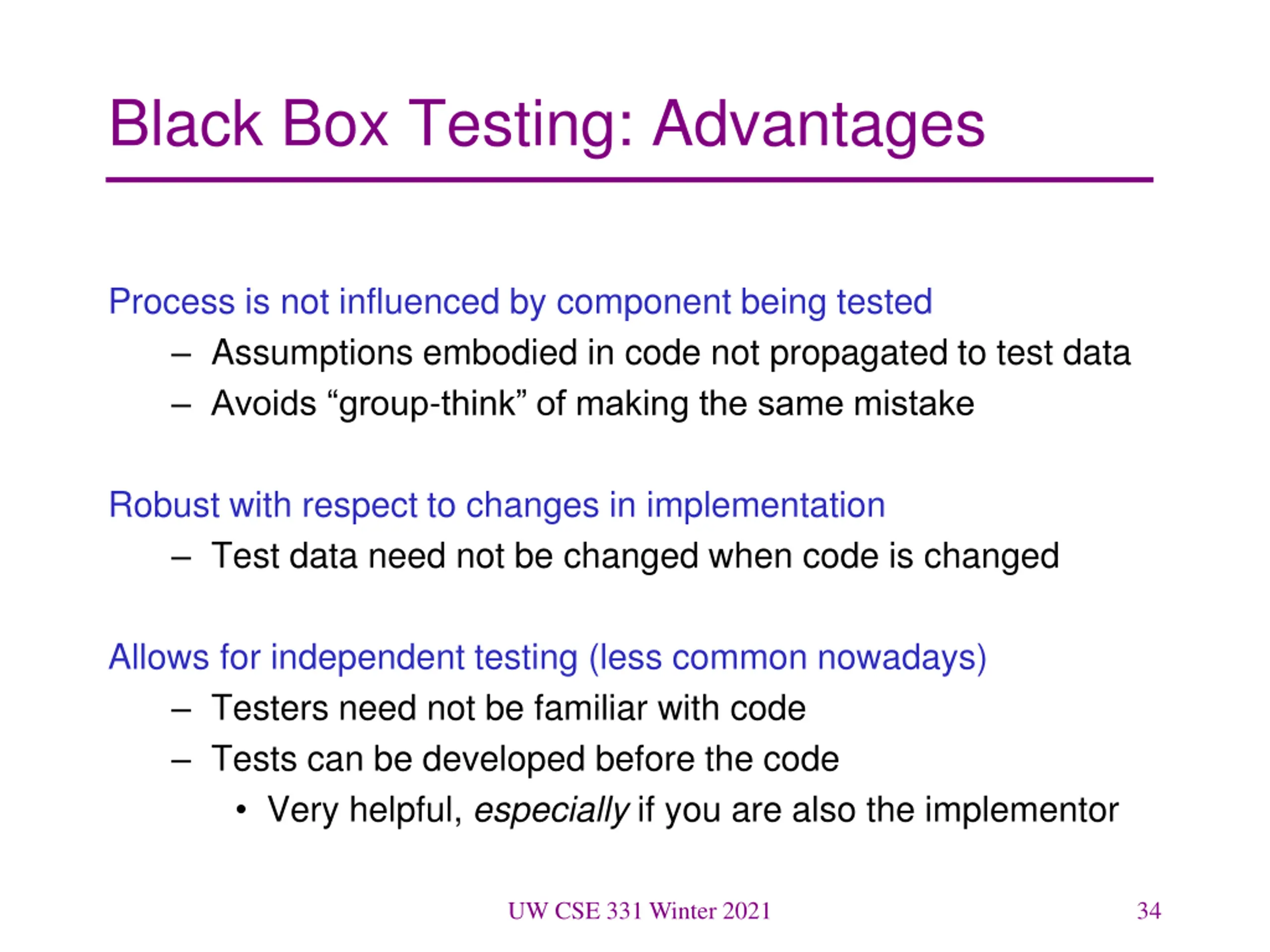 Black Box Testing: Advantages Process is not influenced by component being tested Assumptions embodied in code not propagated to test data Avoids group-think of making the same mistake Robust with respect to changes in implementation Test data need not be changed when code is changed Allows for independent testing (less common nowadays) Testers need not be familiar with code Tests can be developed before the code Very helpful, especially if you are also the implementor UW CSE 331 Winter 2021 34
