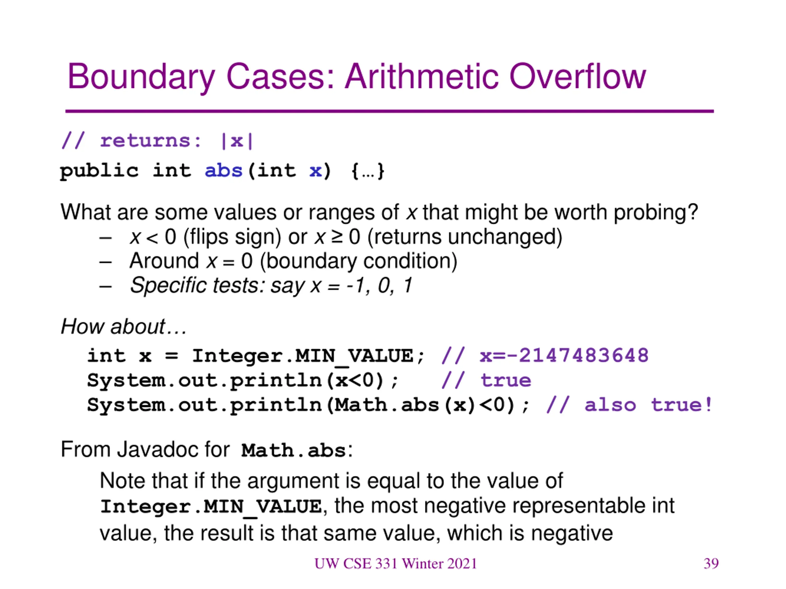 Boundary Cases: Arithmetic Overflow // returns: |x| public int abs(int x) { } What are some values or ranges of x that might be worth probing? x < 0 (flips sign) or x 0 (returns unchanged) Around x = 0 (boundary condition) Specific tests: say x = -1, 0, 1 How about int x = Integer.MIN_VALUE; // x=-2147483648 System.out.println(x<0); // true System.out.println(Math.abs(x)<0); // also true! From Javadoc for Math.abs: Note that if the argument is equal to the value of Integer.MIN_VALUE, the most negative representable int value, the result is that same value, which is negative UW CSE 331 Winter 2021 39