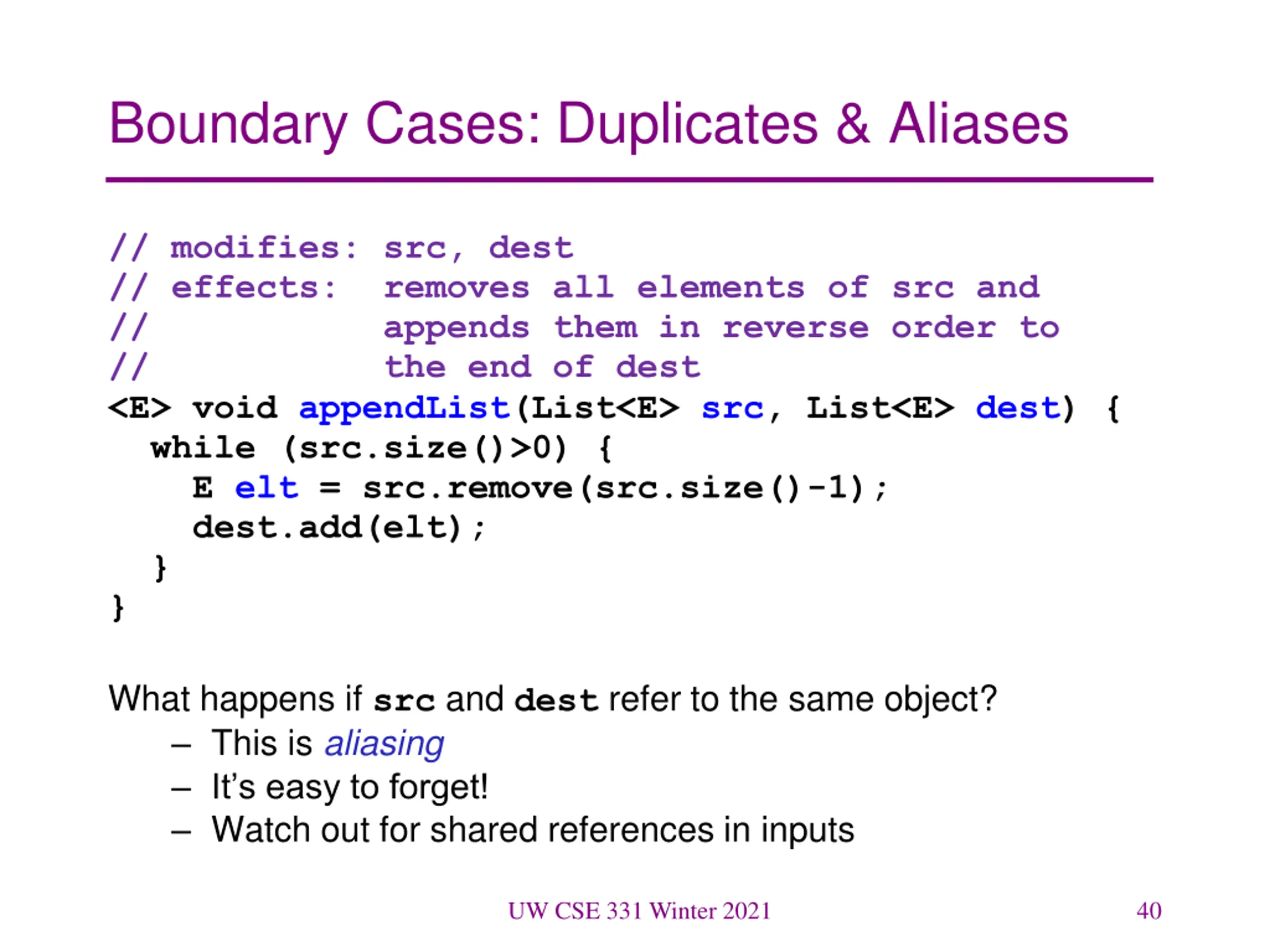 Boundary Cases: Duplicates & Aliases // modifies: src, dest // effects: removes all elements of src and // appends them in reverse order to // the end of dest <E> void appendList(List<E> src, List<E> dest) { while (src.size()>0) { E elt = src.remove(src.size()-1); dest.add(elt); } } What happens if src and dest refer to the same object? This is aliasing It s easy to forget! Watch out for shared references in inputs UW CSE 331 Winter 2021 40