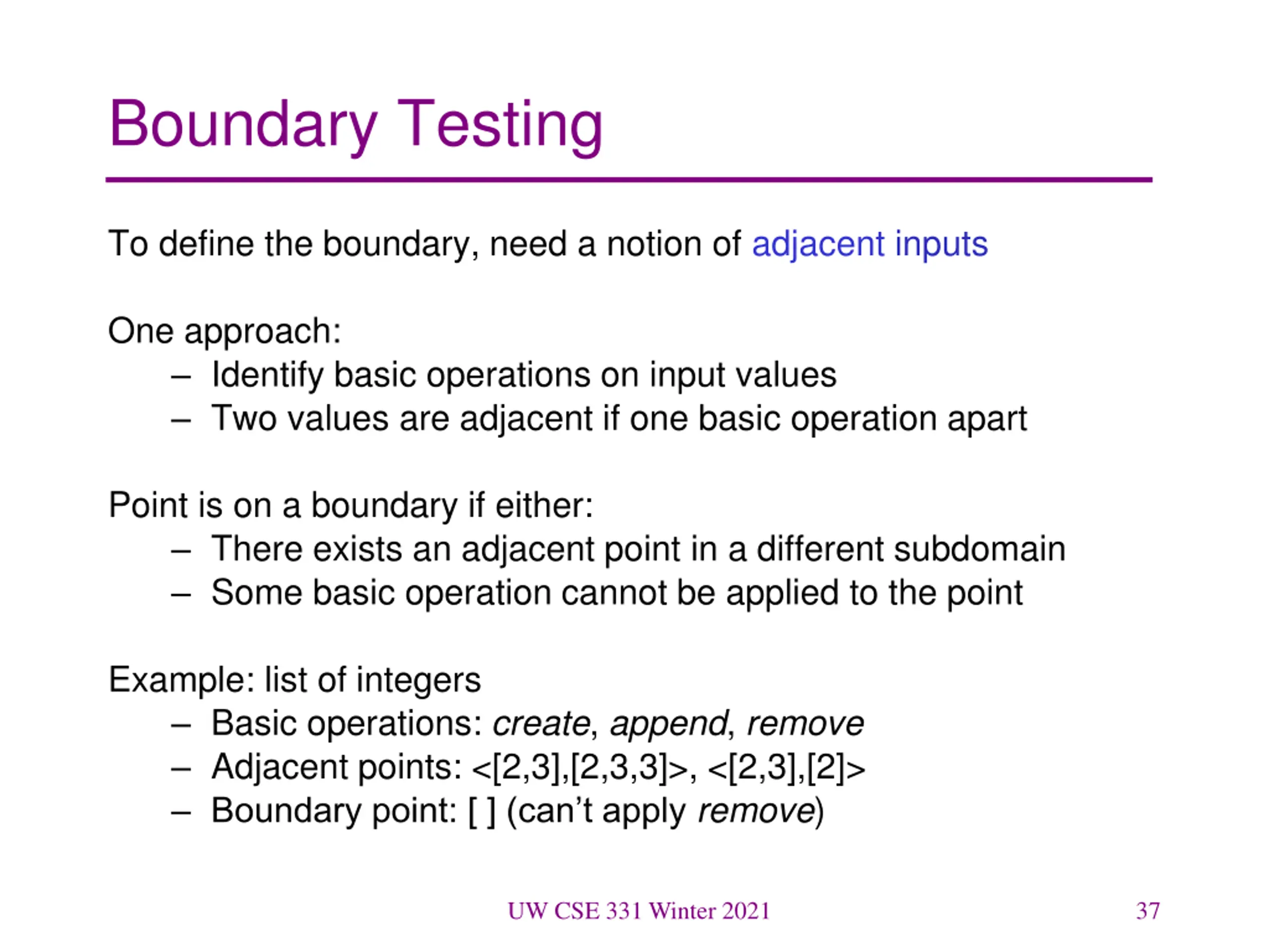 Boundary Testing To define the boundary, need a notion of adjacent inputs One approach: Identify basic operations on input values Two values are adjacent if one basic operation apart Point is on a boundary if either: There exists an adjacent point in a different subdomain Some basic operation cannot be applied to the point Example: list of integers Basic operations: create, append, remove Adjacent points: <[2,3],[2,3,3]>, <[2,3],[2]> Boundary point: [ ] (can t apply remove) UW CSE 331 Winter 2021 37