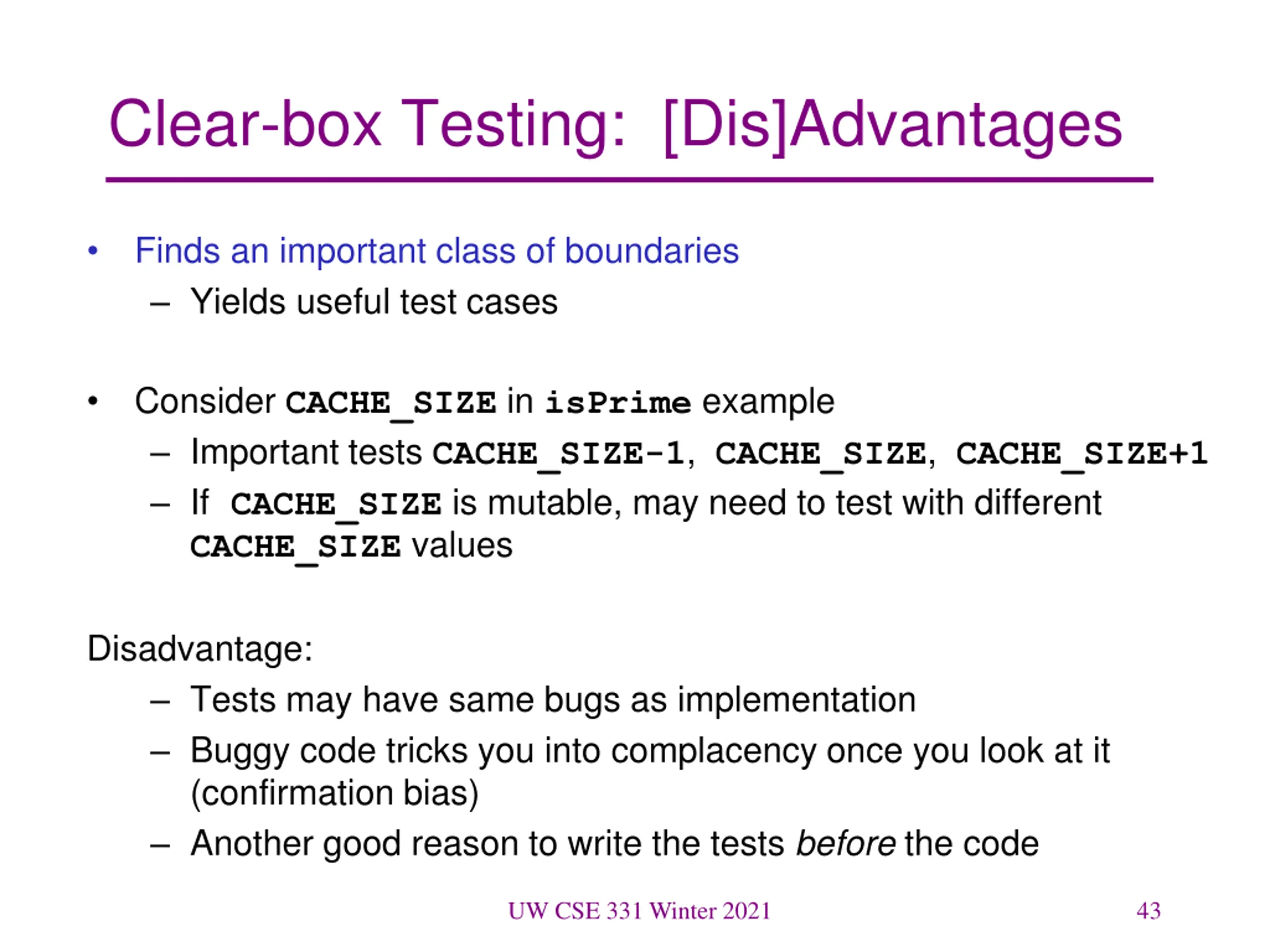 Clear-box Testing Example There are some subdomains that are not evident from the specification, so black-box testing might not catch: boolean[] primeTable = new boolean[CACHE_SIZE]; boolean isPrime(int x) { if (x > CACHE_SIZE) { for (int i=2; i < x/2; i++) { if (x%i==0) return false; } return true; } else { return primeTable[x]; } } UW CSE 331 Winter 2021 42