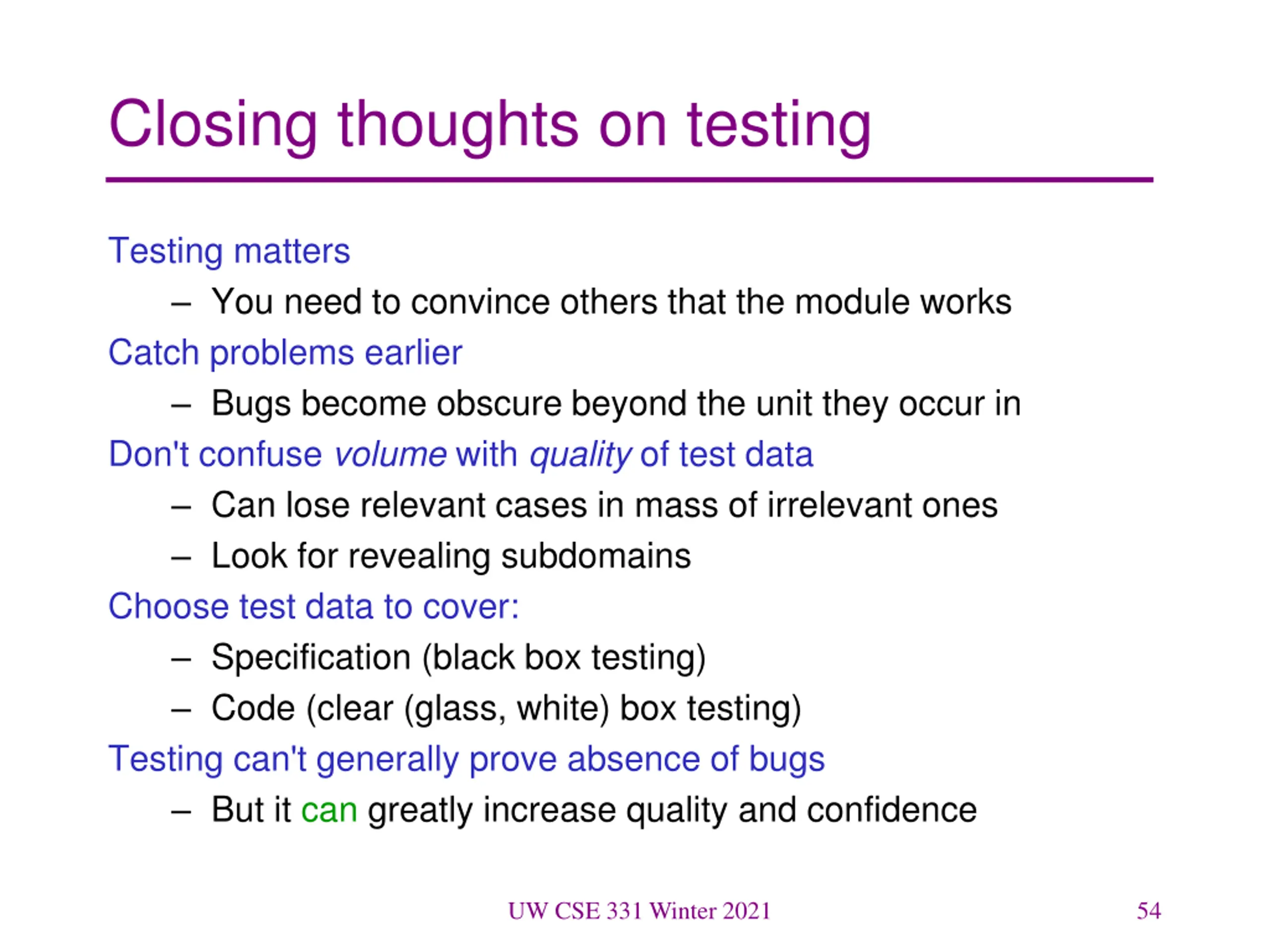 Closing thoughts on testing Testing matters You need to convince others that the module works Catch problems earlier Bugs become obscure beyond the unit they occur in Don't confuse volume with quality of test data Can lose relevant cases in mass of irrelevant ones Look for revealing subdomains Choose test data to cover: Specification (black box testing) Code (clear (glass, white) box testing) Testing can't generally prove absence of bugs But it can greatly increase quality and confidence UW CSE 331 Winter 2021 54