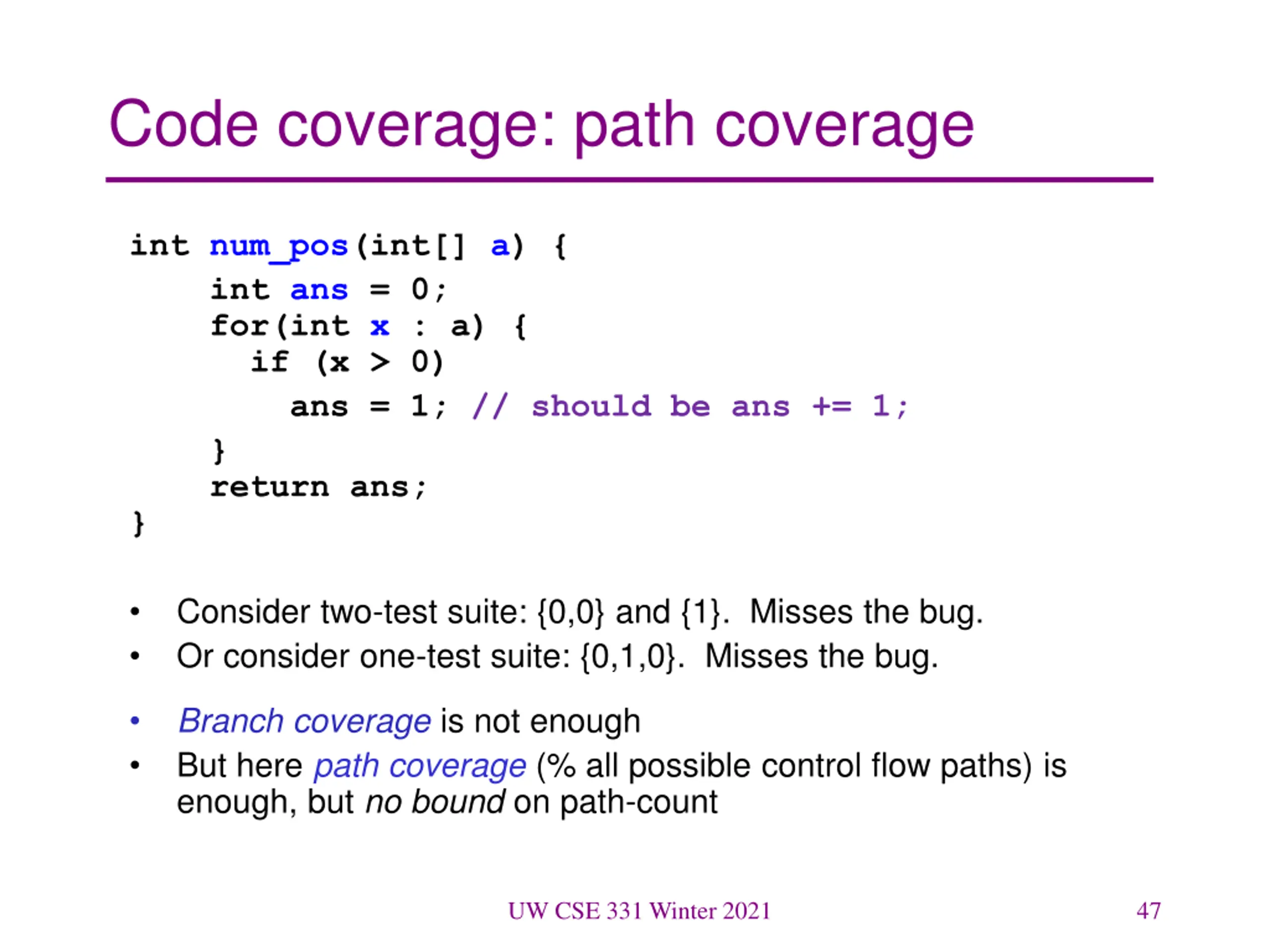 Code coverage: path coverage int num_pos(int[] a) { int ans = 0; for(int x : a) { if (x > 0) ans = 1; // should be ans += 1; } return ans; } Consider two-test suite: {0,0} and {1}. Misses the bug. Or consider one-test suite: {0,1,0}. Misses the bug. Branch coverage is not enough But here path coverage (% all possible control flow paths) is enough, but no bound on path-count UW CSE 331 Winter 2021 47