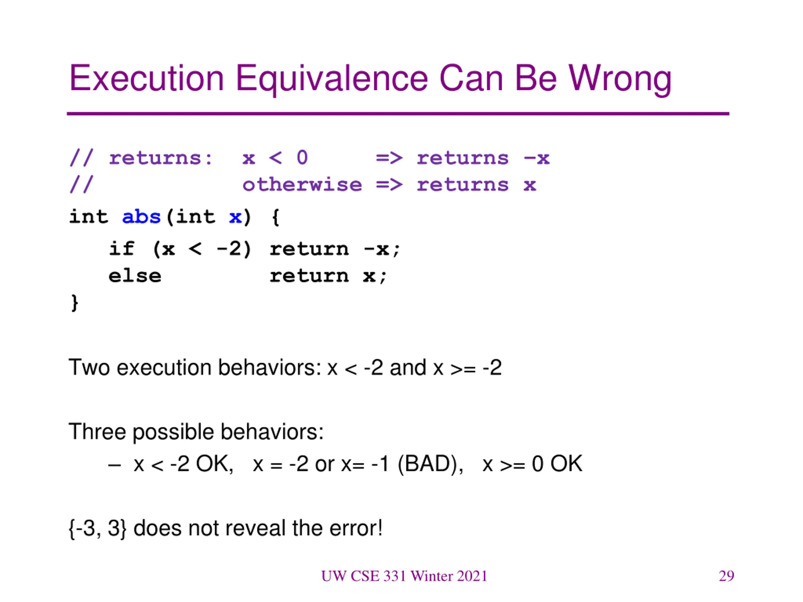 Execution Equivalence Can Be Wrong // returns: x < 0 => returns x // otherwise => returns x int abs(int x) { if (x < -2) return -x; else return x; } Two execution behaviors: x < -2 and x >= -2 Three possible behaviors: x < -2 OK, x = -2 or x= -1 (BAD), x >= 0 OK {-3, 3} does not reveal the error! UW CSE 331 Winter 2021 29