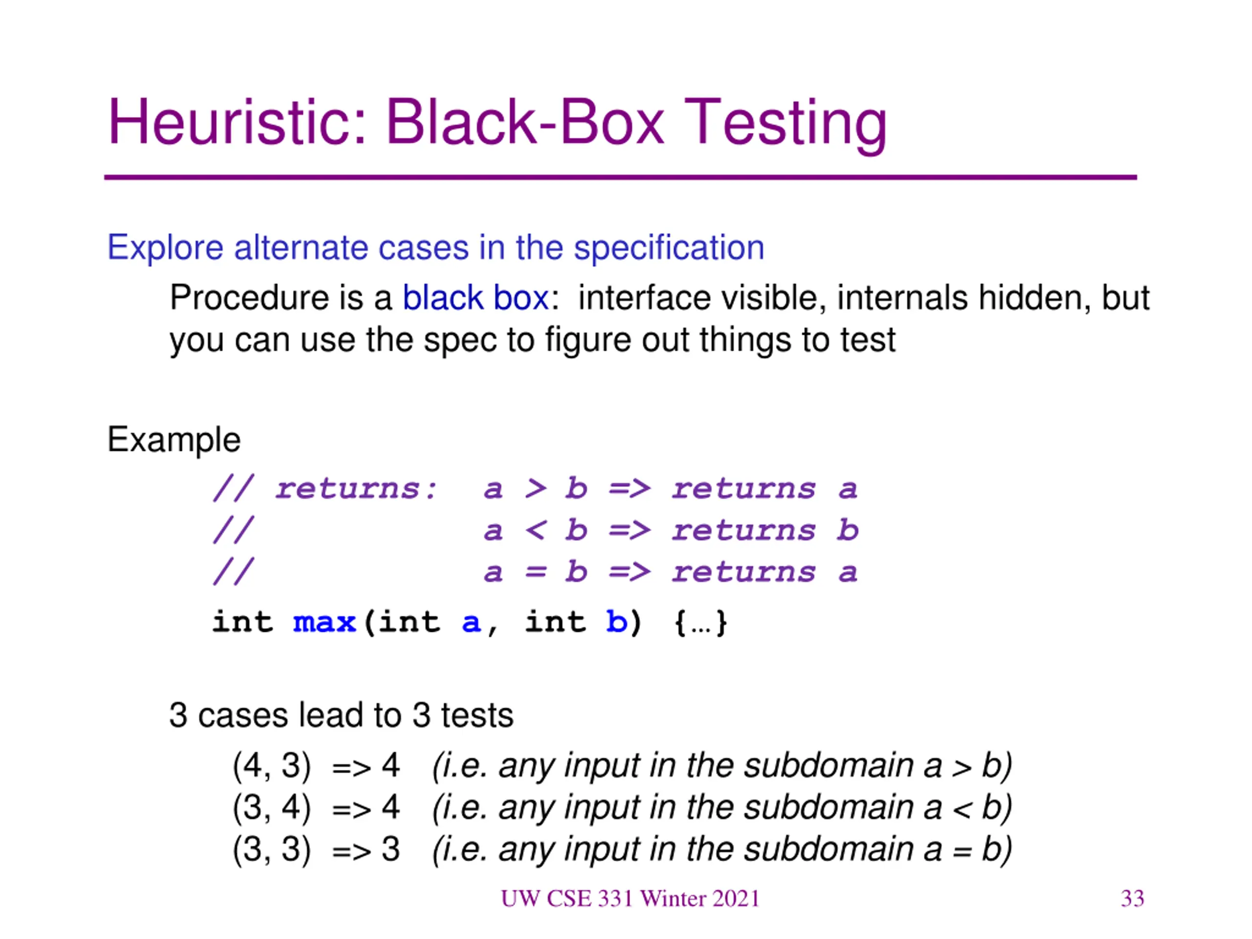 Heuristic: Black-Box Testing Explore alternate cases in the specification Procedure is a black box: interface visible, internals hidden, but you can use the spec to figure out things to test Example // returns: a > b => returns a // a < b => returns b // a = b => returns a int max(int a, int b) { } 3 cases lead to 3 tests (4, 3) => 4 (i.e. any input in the subdomain a > b) (3, 4) => 4 (i.e. any input in the subdomain a < b) (3, 3) => 3 (i.e. any input in the subdomain a = b) UW CSE 331 Winter 2021 33