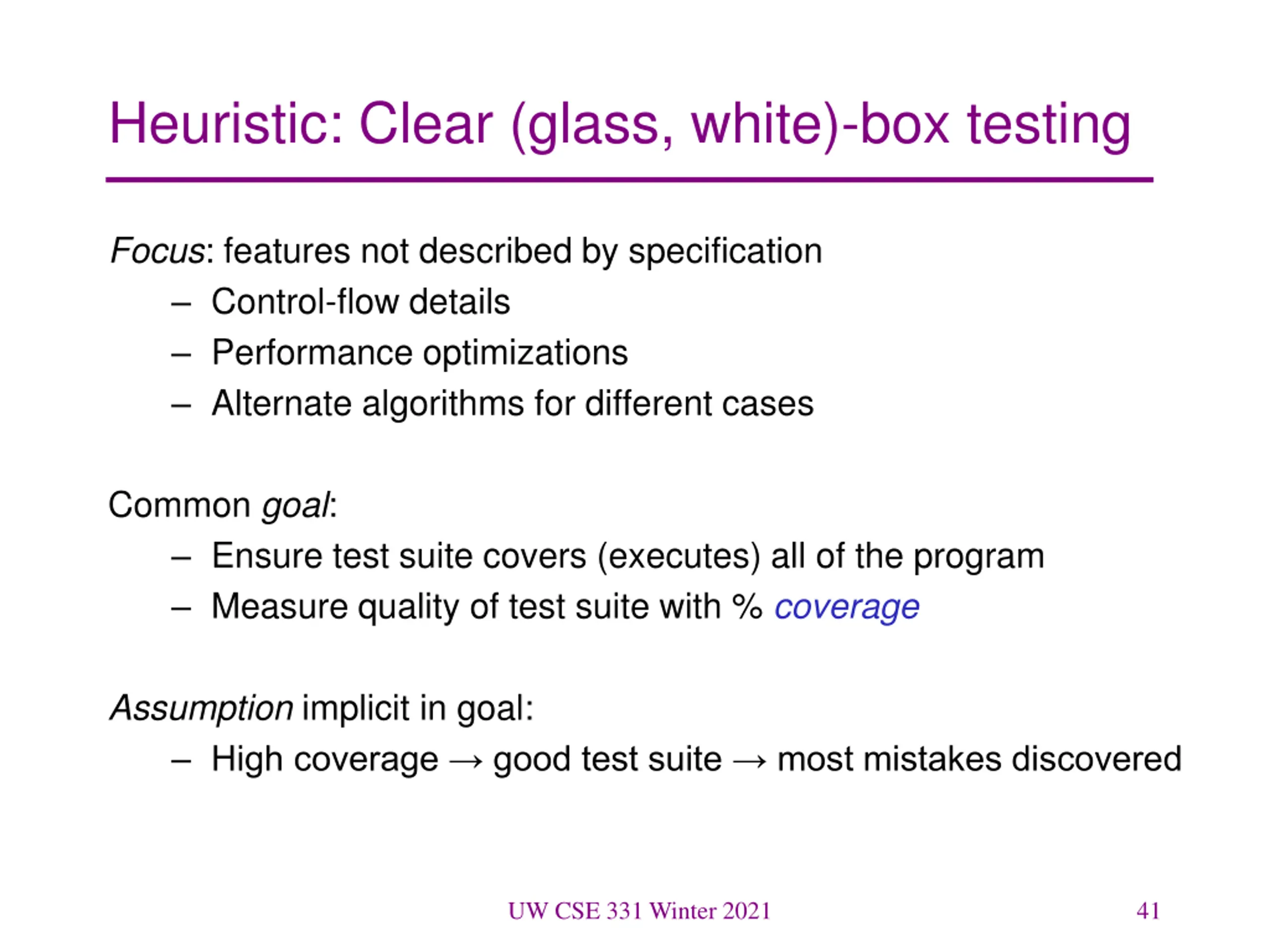 Heuristic: Clear (glass, white)-box testing Focus: features not described by specification Control-flow details Performance optimizations Alternate algorithms for different cases Common goal: Ensure test suite covers (executes) all of the program Measure quality of test suite with % coverage Assumption implicit in goal: High coverage good test suite most mistakes discovered UW CSE 331 Winter 2021 41