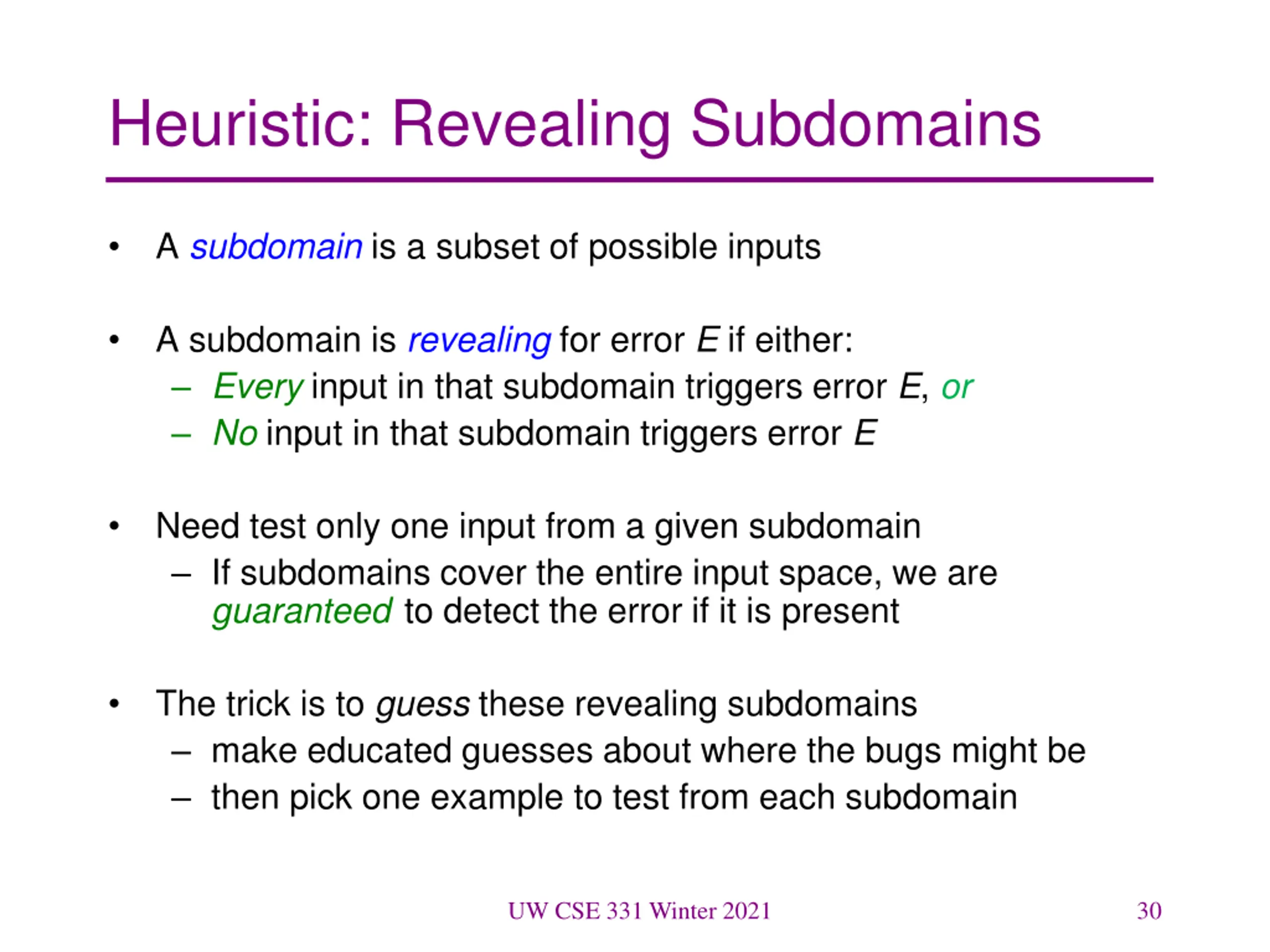 Heuristic: Revealing Subdomains A subdomain is a subset of possible inputs A subdomain is revealing for error E if either: Every input in that subdomain triggers error E, or No input in that subdomain triggers error E Need test only one input from a given subdomain If subdomains cover the entire input space, we are guaranteed to detect the error if it is present The trick is to guess these revealing subdomains make educated guesses about where the bugs might be then pick one example to test from each subdomain UW CSE 331 Winter 2021 30