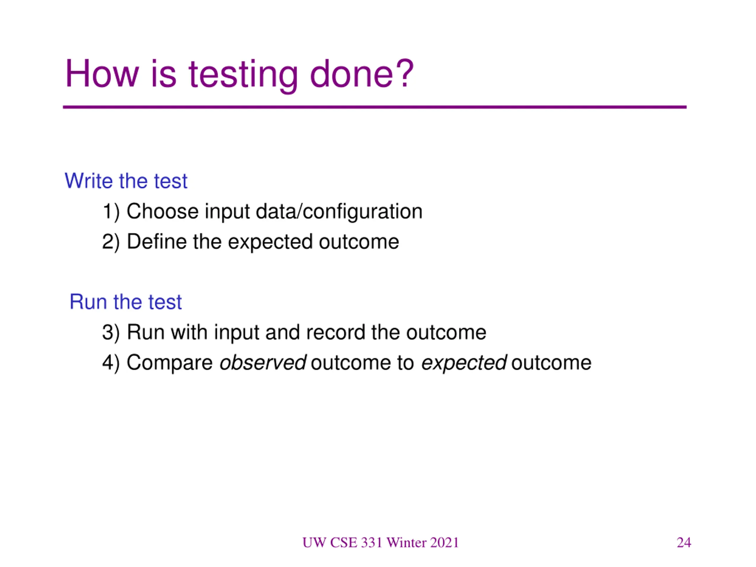 How is testing done? Write the test 1) Choose input data/configuration 2) Define the expected outcome Run the test 3) Run with input and record the outcome 4) Compare observed outcome to expected outcome UW CSE 331 Winter 2021 24