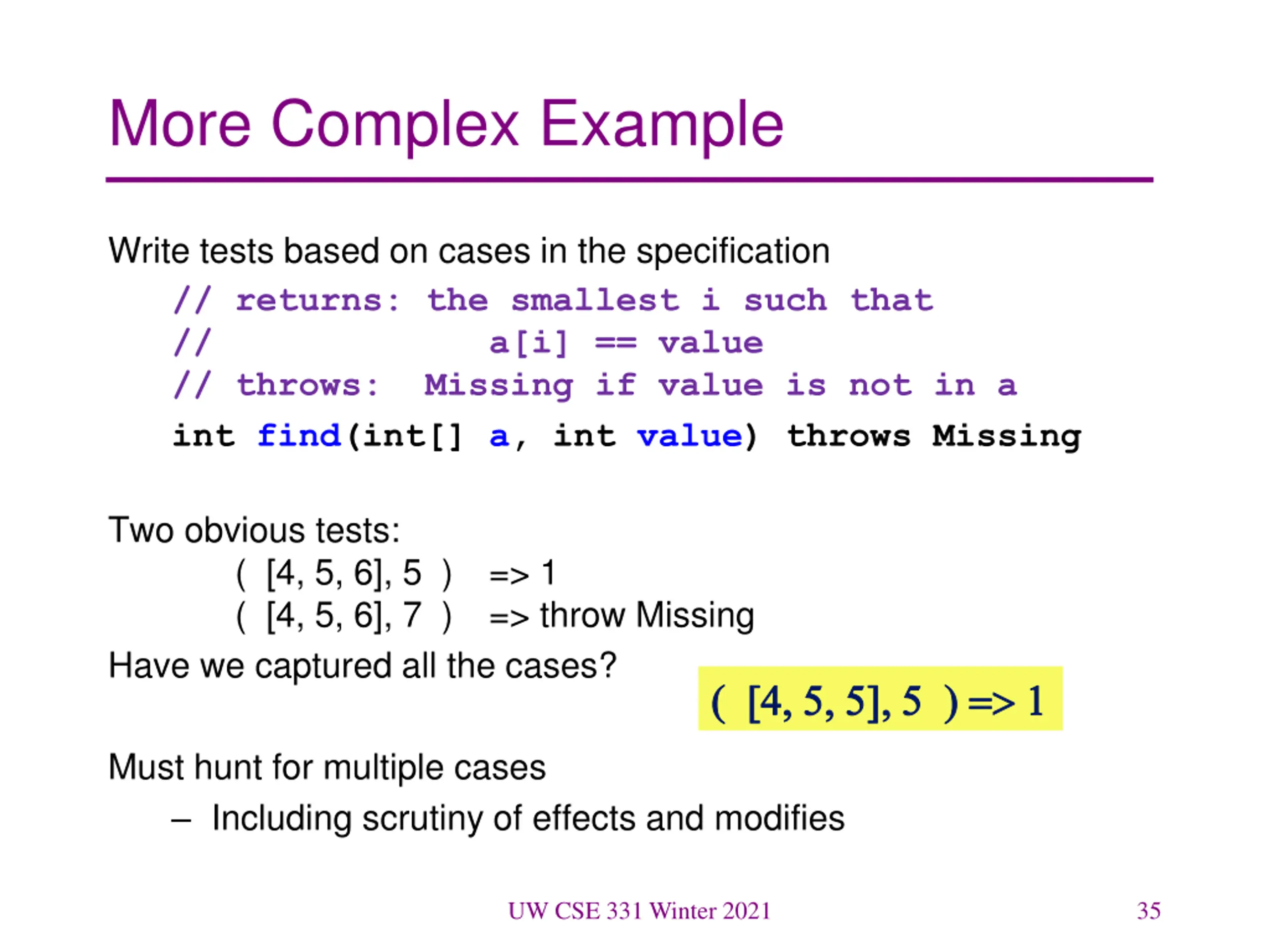 More Complex Example Write tests based on cases in the specification // returns: the smallest i such that // a[i] == value // throws: Missing if value is not in a int find(int[] a, int value) throws Missing Two obvious tests: ( [4, 5, 6], 5 ) => 1 ( [4, 5, 6], 7 ) => throw Missing Have we captured all the cases? ( ( ) ) = = Must hunt for multiple cases Including scrutiny of effects and modifies UW CSE 331 Winter 2021 35