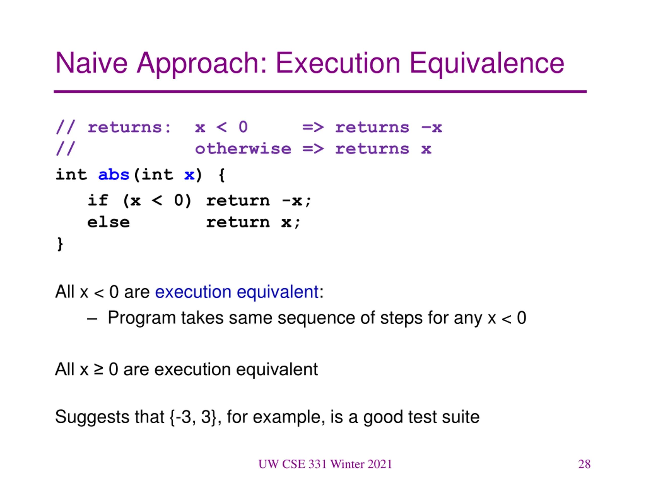 Naive Approach: Execution Equivalence // returns: x < 0 => returns x // otherwise => returns x int abs(int x) { if (x < 0) return -x; else return x; } All x < 0 are execution equivalent: Program takes same sequence of steps for any x < 0 All x 0 are execution equivalent Suggests that {-3, 3}, for example, is a good test suite UW CSE 331 Winter 2021 28