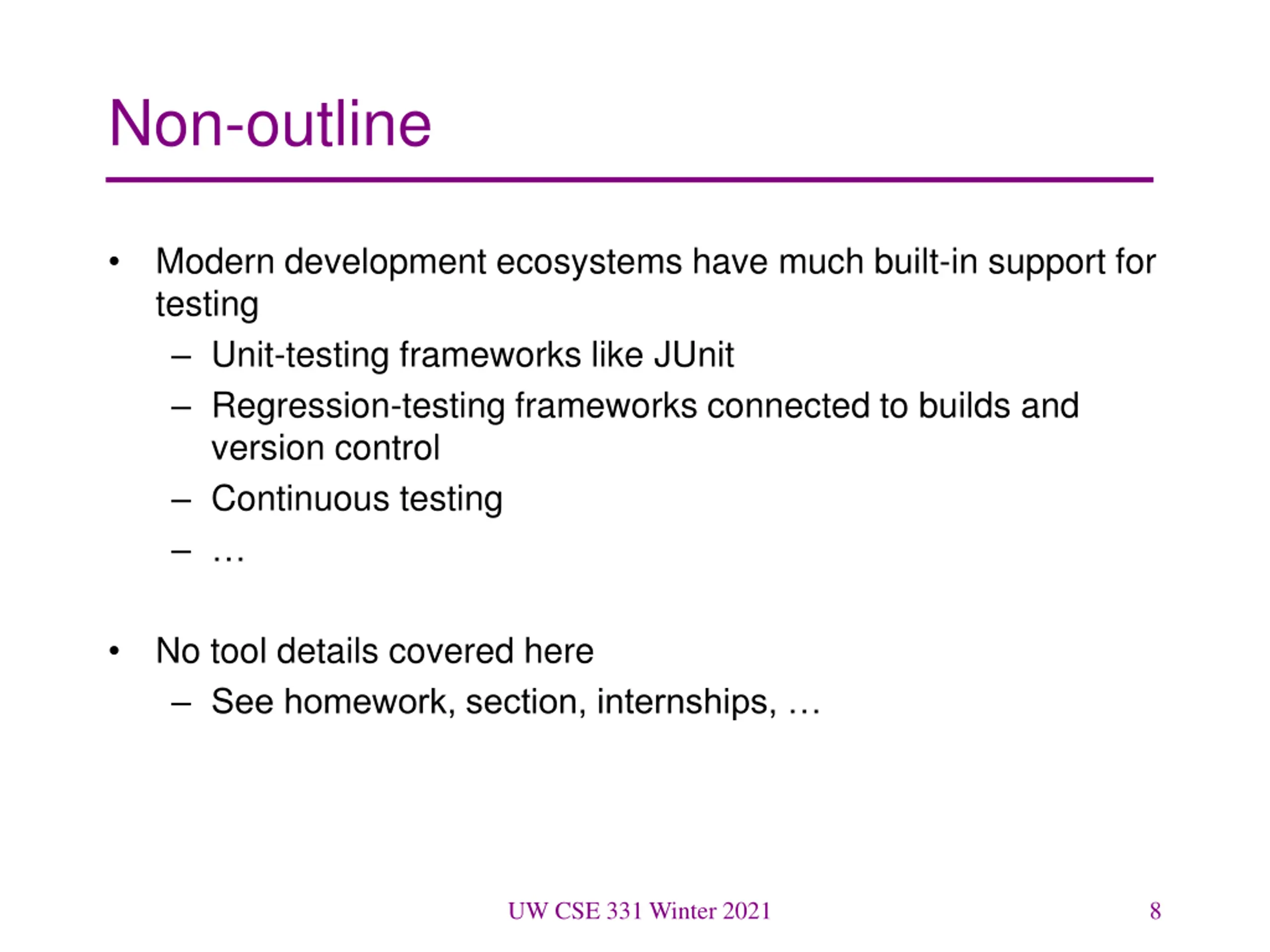 Non-outline Modern development ecosystems have much built-in support for testing Unit-testing frameworks like JUnit Regression-testing frameworks connected to builds and version control Continuous testing No tool details covered here See homework, section, internships, UW CSE 331 Winter 2021 8