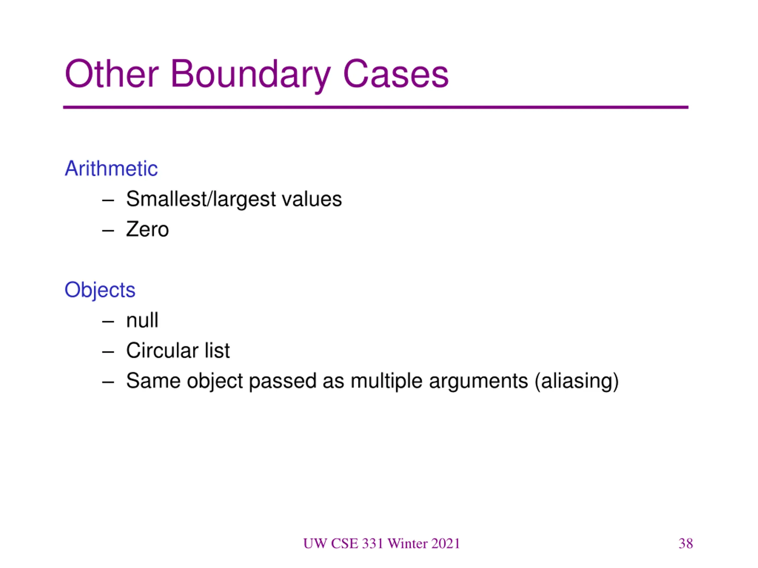 Other Boundary Cases Arithmetic Smallest/largest values Zero Objects null Circular list Same object passed as multiple arguments (aliasing) UW CSE 331 Winter 2021 38