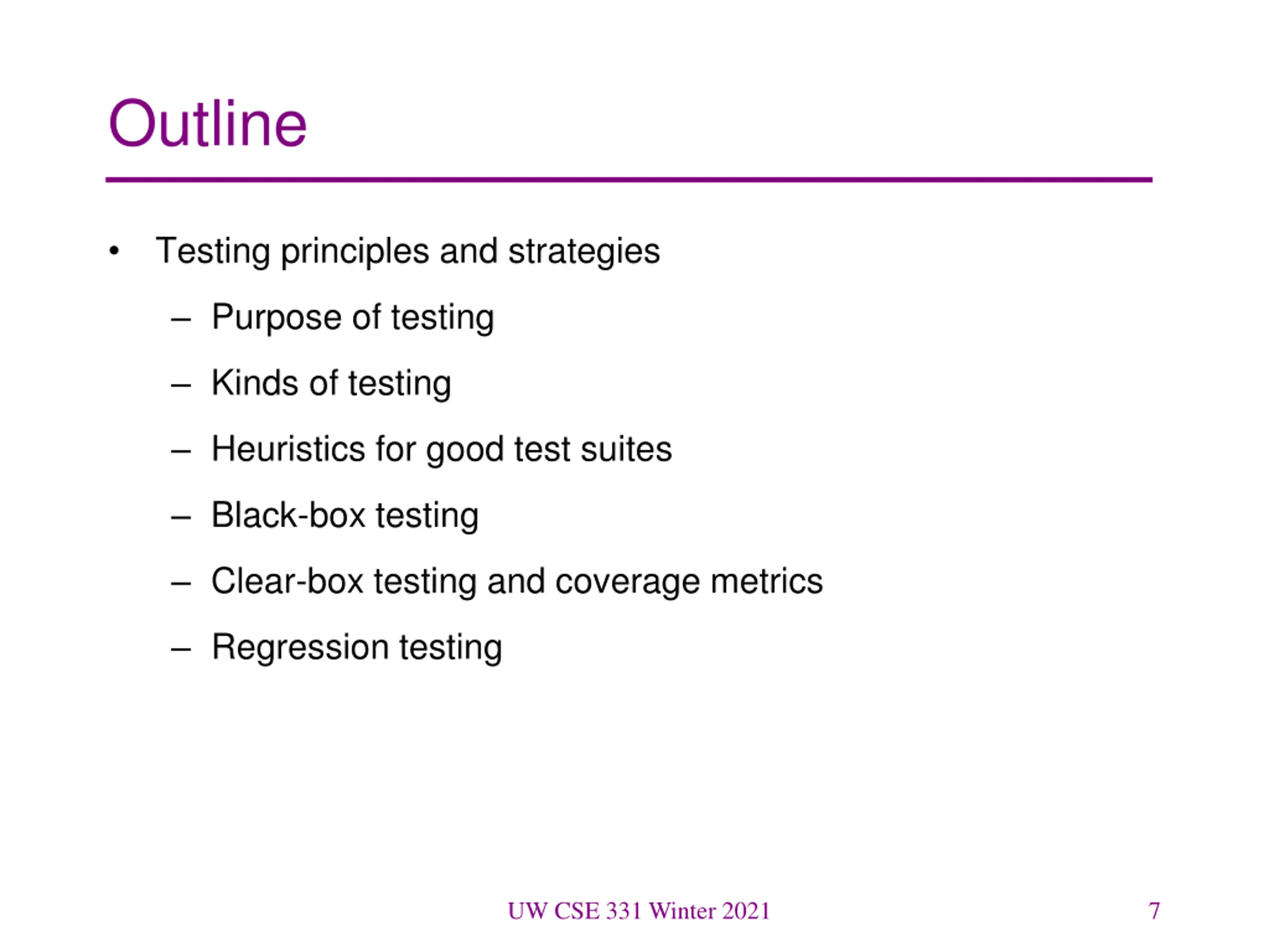 Outline Testing principles and strategies Purpose of testing Kinds of testing Heuristics for good test suites Black-box testing Clear-box testing and coverage metrics Regression testing UW CSE 331 Winter 2021 7