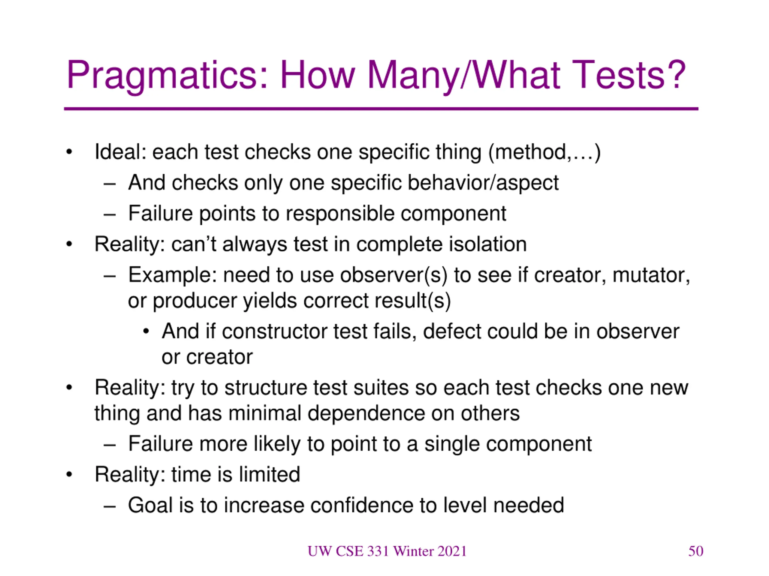 Pragmatics: How Many/What Tests? Ideal: each test checks one specific thing (method, ) And checks only one specific behavior/aspect Failure points to responsible component Reality: can t always test in complete isolation Example: need to use observer(s) to see if creator, mutator, or producer yields correct result(s) And if constructor test fails, defect could be in observer or creator Reality: try to structure test suites so each test checks one new thing and has minimal dependence on others Failure more likely to point to a single component Reality: time is limited Goal is to increase confidence to level needed UW CSE 331 Winter 2021 50
