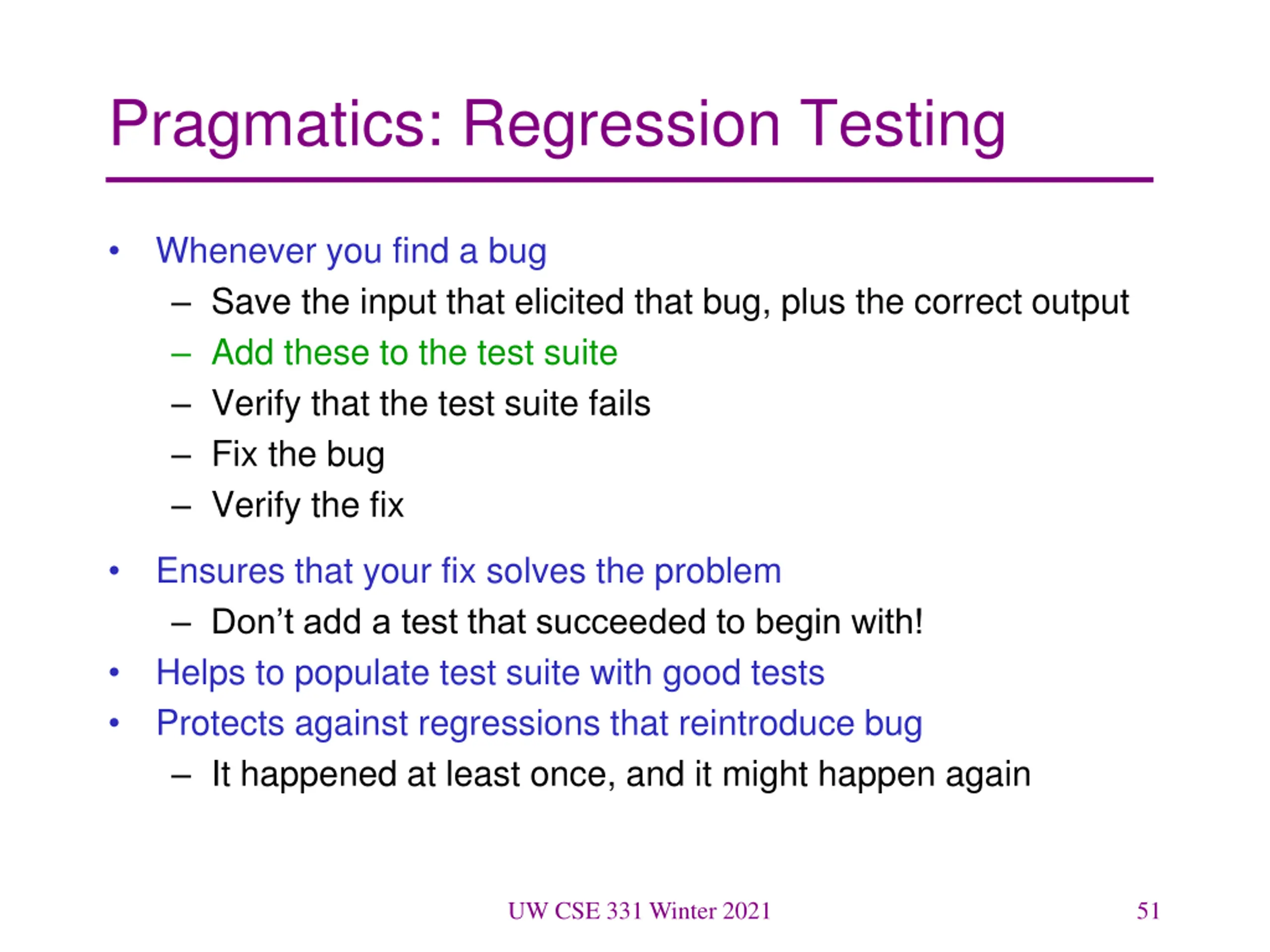Pragmatics: Regression Testing Whenever you find a bug Save the input that elicited that bug, plus the correct output Add these to the test suite Verify that the test suite fails Fix the bug Verify the fix Ensures that your fix solves the problem Don t add a test that succeeded to begin with! Helps to populate test suite with good tests Protects against regressions that reintroduce bug It happened at least once, and it might happen again UW CSE 331 Winter 2021 51