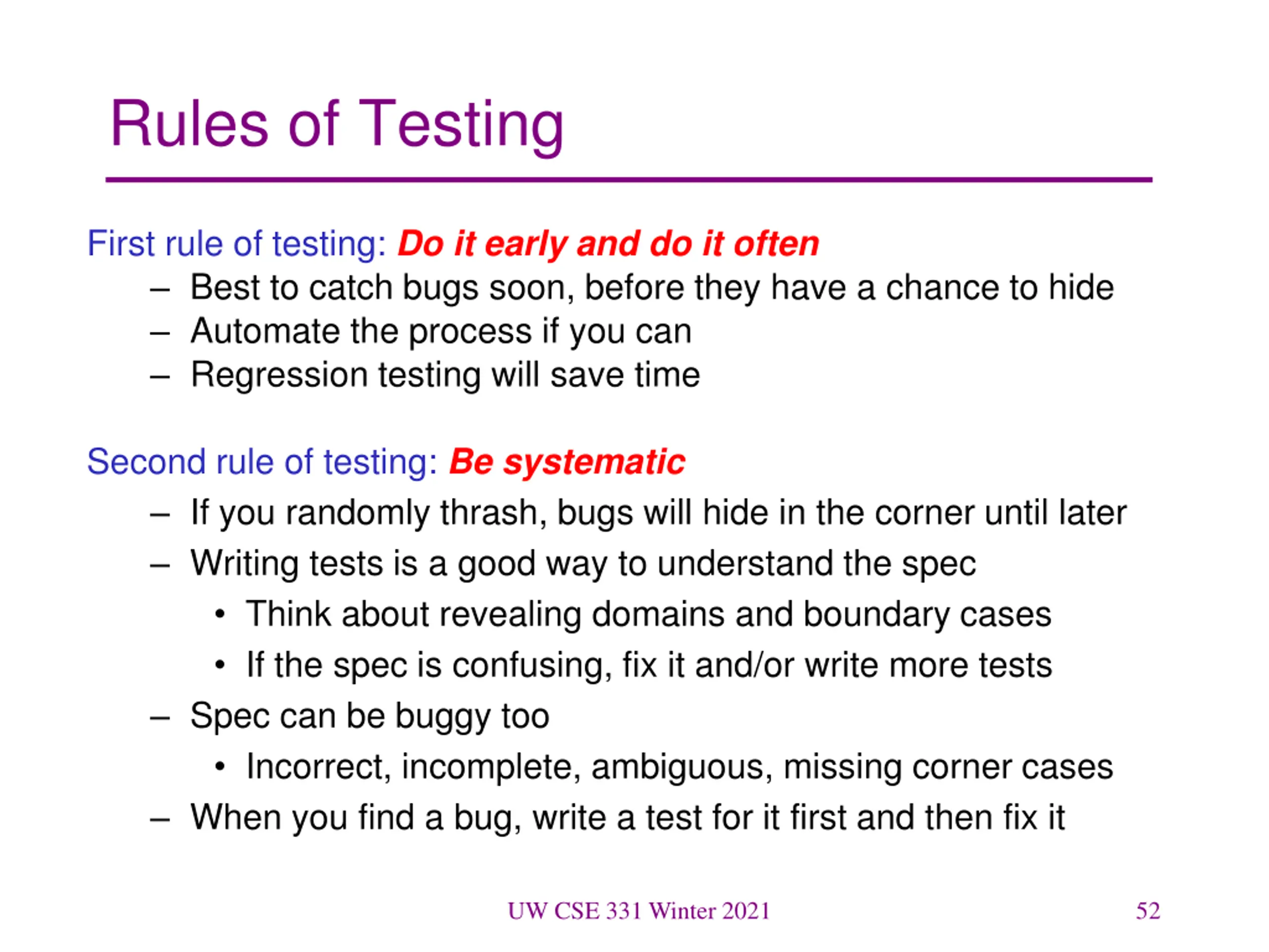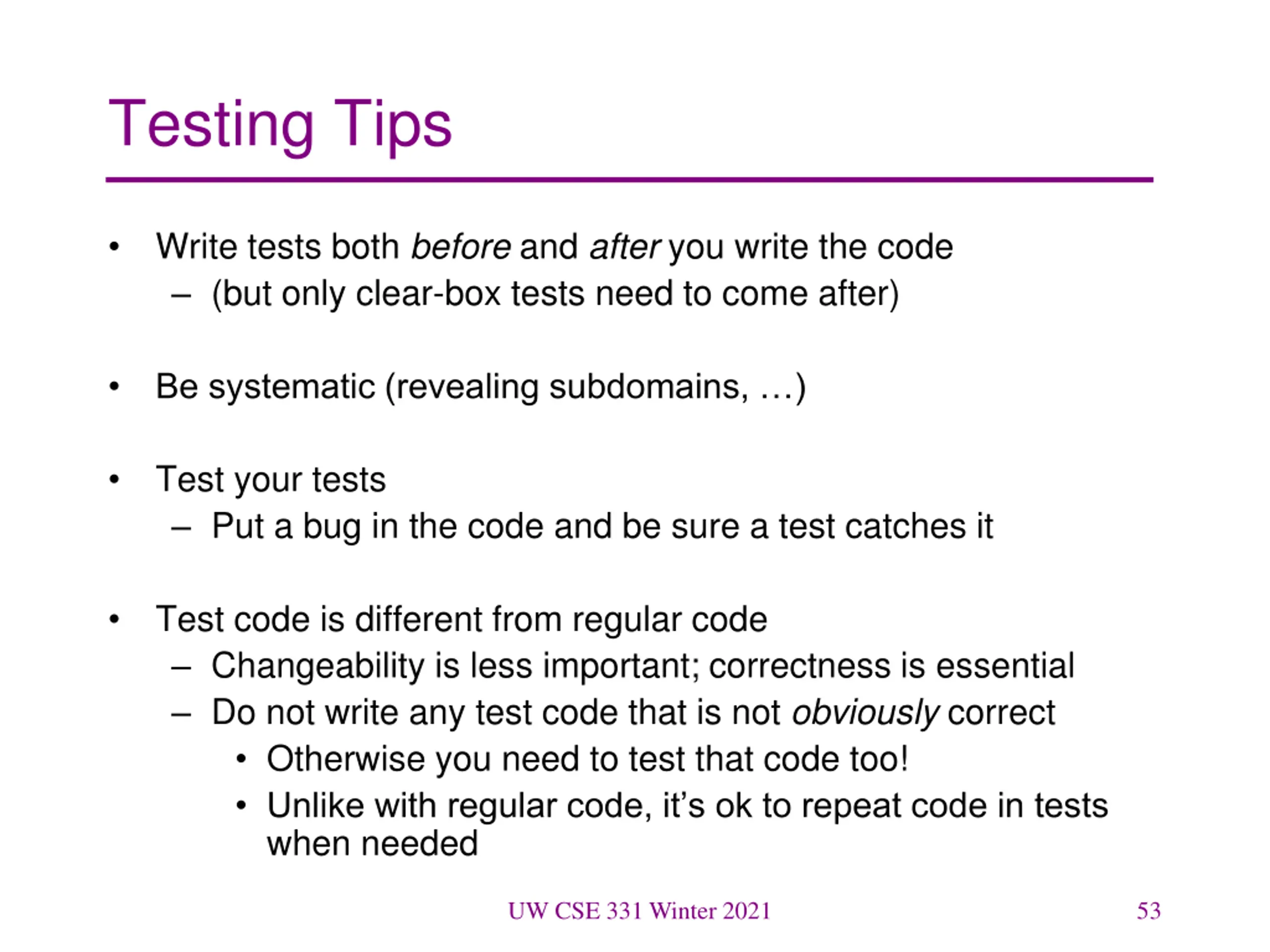 Rules of Testing First rule of testing: Do it early and do it often Best to catch bugs soon, before they have a chance to hide Automate the process if you can Regression testing will save time Second rule of testing: Be systematic If you randomly thrash, bugs will hide in the corner until later Writing tests is a good way to understand the spec Think about revealing domains and boundary cases If the spec is confusing, fix it and/or write more tests Spec can be buggy too Incorrect, incomplete, ambiguous, missing corner cases When you find a bug, write a test for it first and then fix it UW CSE 331 Winter 2021 52