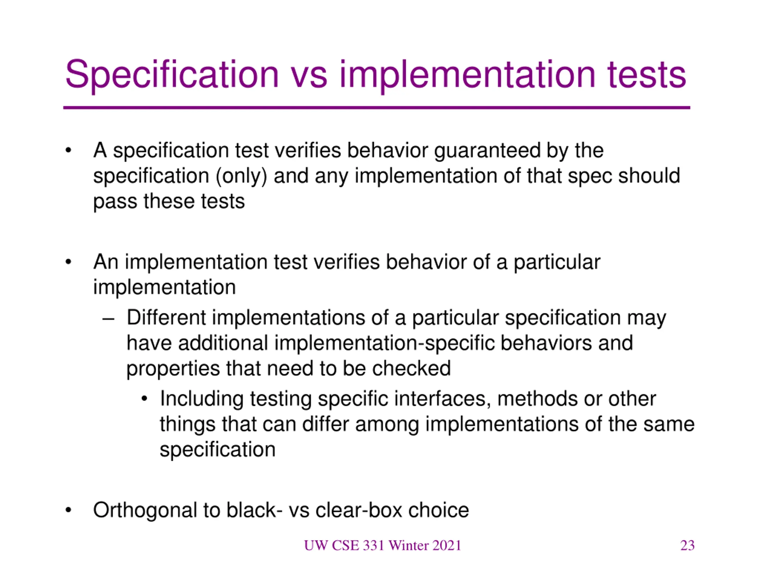 Specification vs implementation tests A specification test verifies behavior guaranteed by the specification (only) and any implementation of that spec should pass these tests An implementation test verifies behavior of a particular implementation Different implementations of a particular specification may have additional implementation-specific behaviors and properties that need to be checked Including testing specific interfaces, methods or other things that can differ among implementations of the same specification Orthogonal to black- vs clear-box choice UW CSE 331 Winter 2021 23
