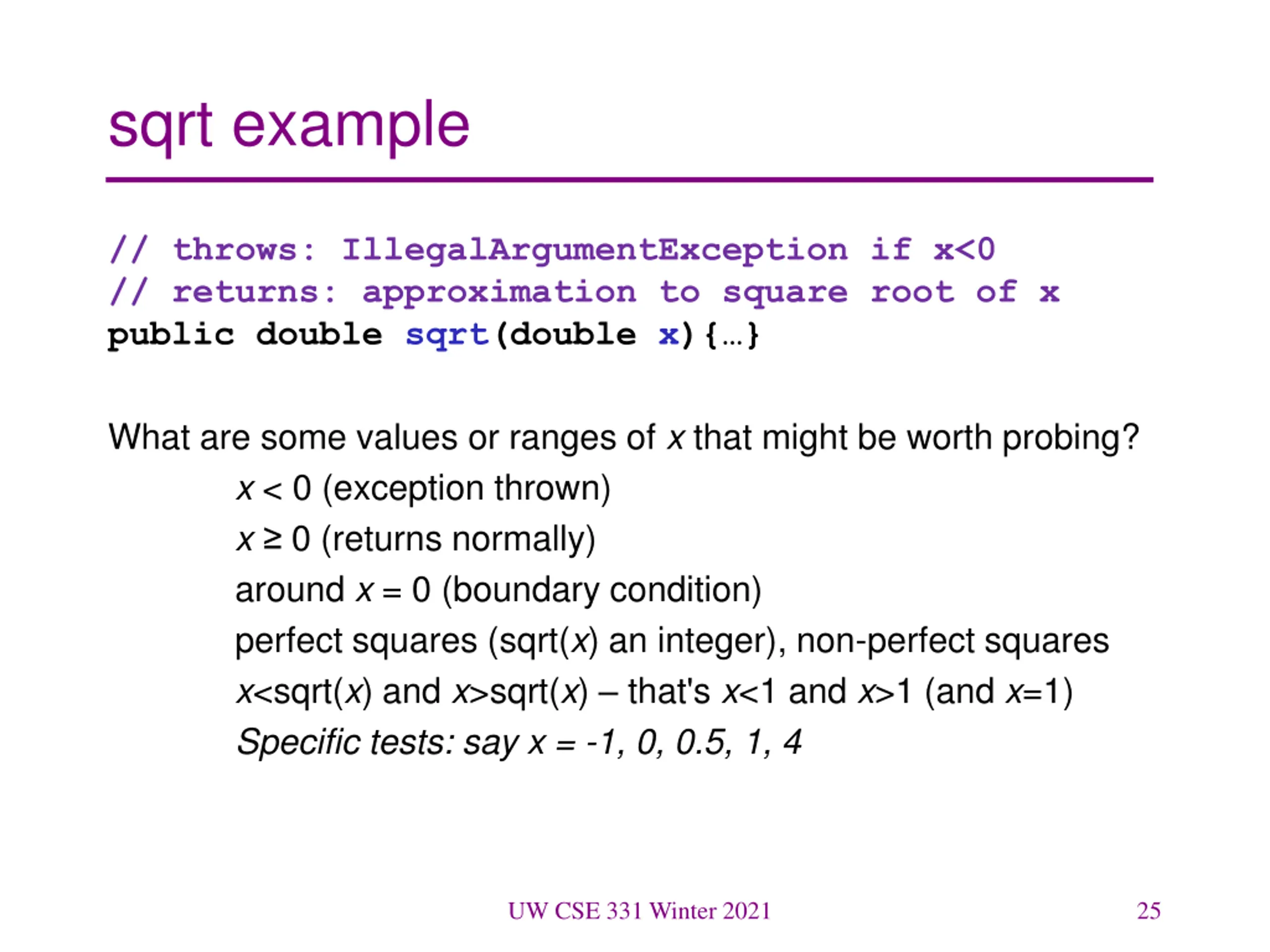 sqrt example // throws: IllegalArgumentException if x<0 // returns: approximation to square root of x public double sqrt(double x){ } What are some values or ranges of x that might be worth probing? x < 0 (exception thrown) x 0 (returns normally) around x = 0 (boundary condition) perfect squares (sqrt(x) an integer), non-perfect squares x<sqrt(x) and x>sqrt(x) that's x<1 and x>1 (and x=1) Specific tests: say x = -1, 0, 0.5, 1, 4 UW CSE 331 Winter 2021 25