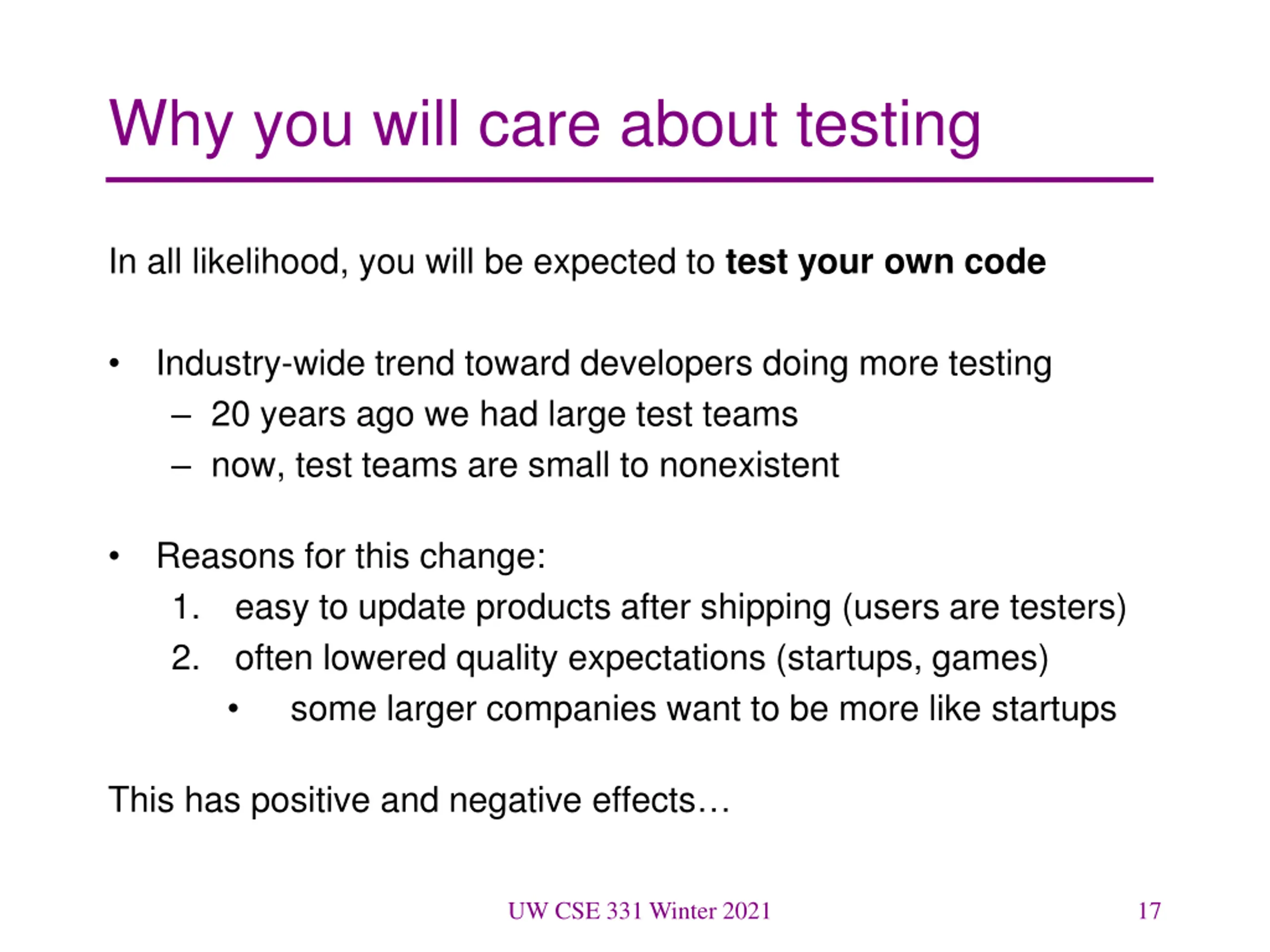 Why you will care about testing In all likelihood, you will be expected to test your own code Industry-wide trend toward developers doing more testing 20 years ago we had large test teams now, test teams are small to nonexistent Reasons for this change: 1. easy to update products after shipping (users are testers) 2. often lowered quality expectations (startups, games) some larger companies want to be more like startups This has positive and negative effects UW CSE 331 Winter 2021 17