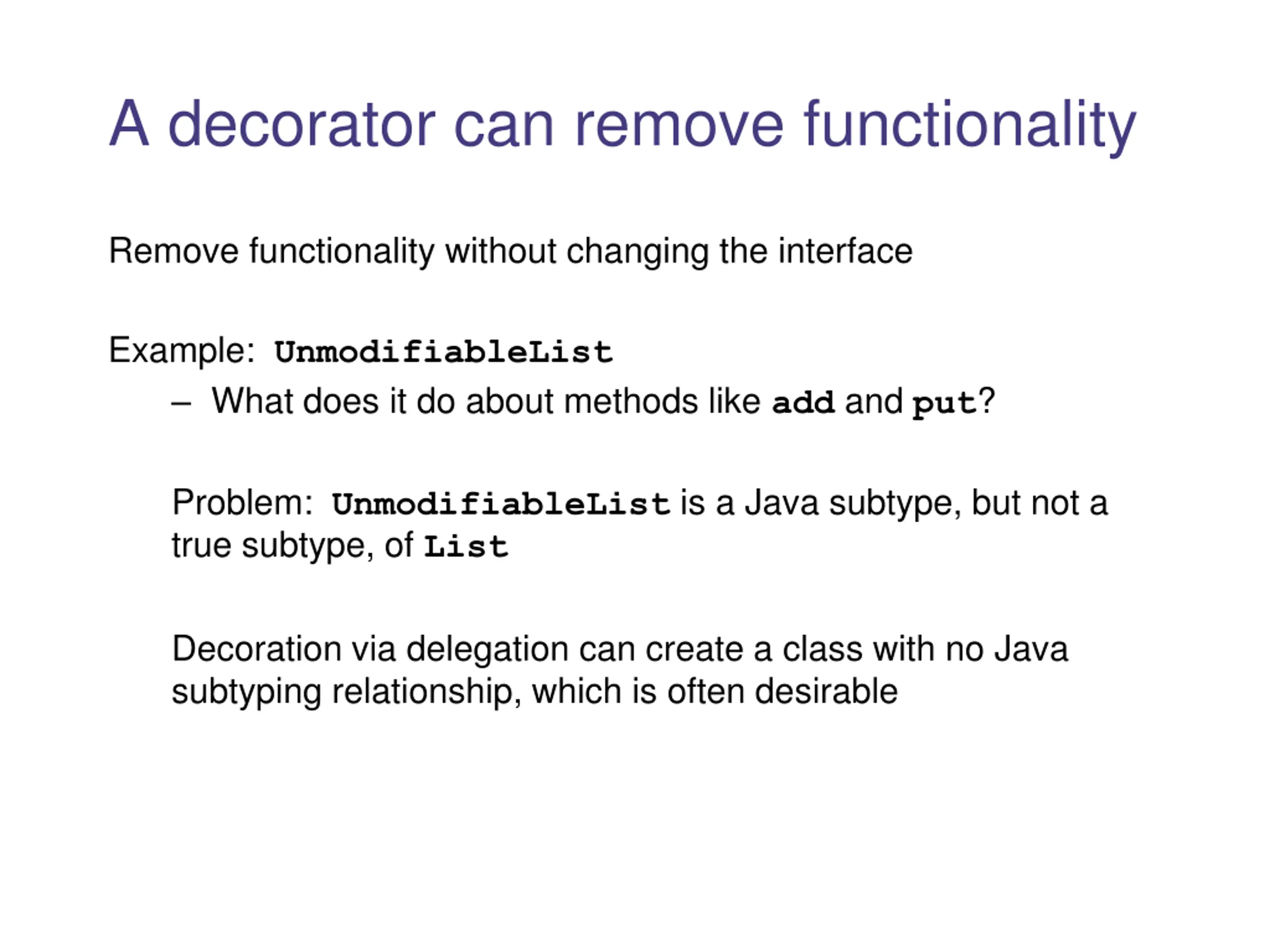 A decorator can remove functionality Remove functionality without changing the interface Example: UnmodifiableList What does it do about methods like add and put? Problem: UnmodifiableList is a Java subtype, but not a true subtype, of List Decoration via delegation can create a class with no Java subtyping relationship, which is often desirable