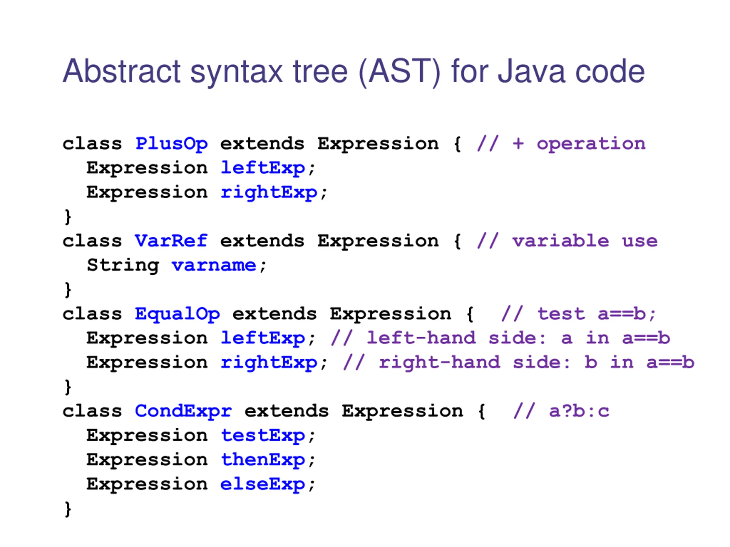 Abstract syntax tree (AST) for Java code class PlusOp extends Expression { // + operation Expression leftExp; Expression rightExp; } class VarRef extends Expression { // variable use String varname; } class EqualOp extends Expression { // test a==b; Expression leftExp; // left-hand side: a in a==b Expression rightExp; // right-hand side: b in a==b } class CondExpr extends Expression { // a?b:c Expression testExp; Expression thenExp; Expression elseExp; }