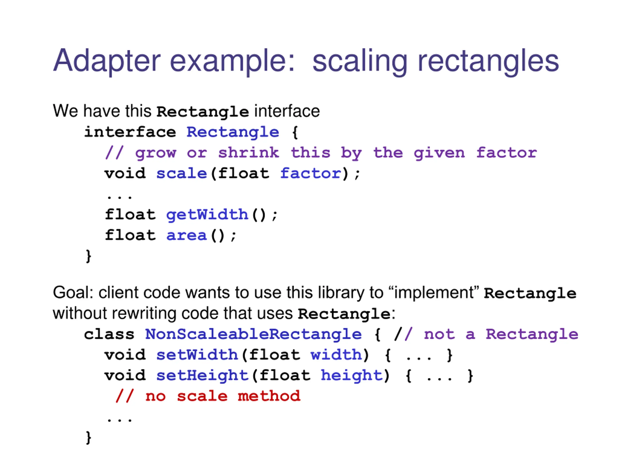 Adapter example: scaling rectangles We have this Rectangle interface interface Rectangle { // grow or shrink this by the given factor void scale(float factor); ... float getWidth(); float area(); } Goal: client code wants to use this library to implement Rectangle without rewriting code that uses Rectangle: class NonScaleableRectangle { // not a Rectangle void setWidth(float width) { ... } void setHeight(float height) { ... } // no scale method ... }
