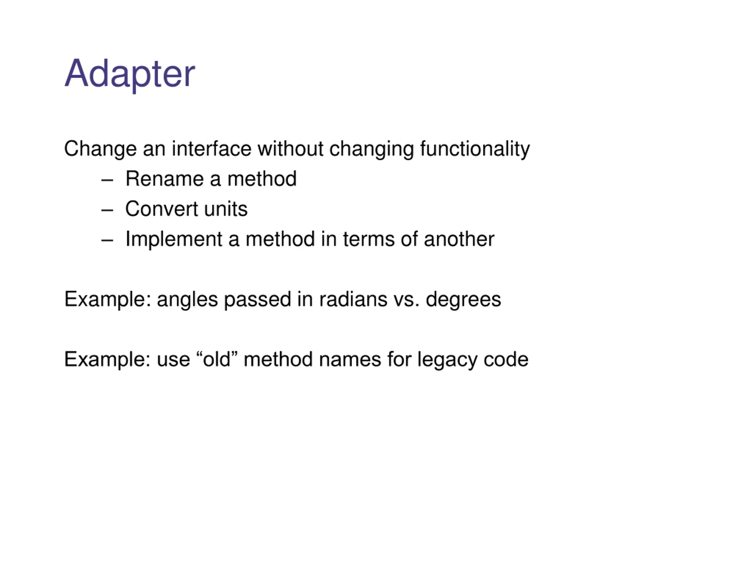 Adapter Change an interface without changing functionality Rename a method Convert units Implement a method in terms of another Example: angles passed in radians vs. degrees Example: use old method names for legacy code