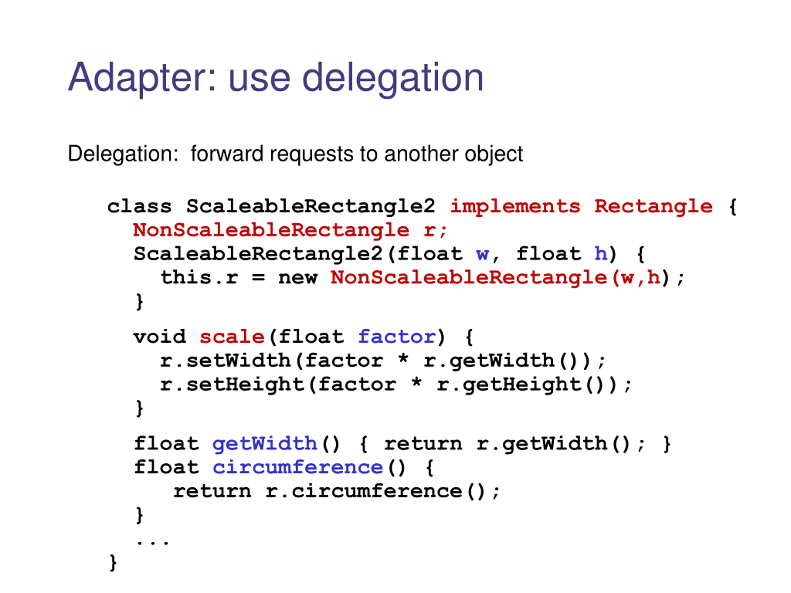 Adapter: use delegation Delegation: forward requests to another object class ScaleableRectangle2 implements Rectangle { NonScaleableRectangle r; ScaleableRectangle2(float w, float h) { this.r = new NonScaleableRectangle(w,h); } void scale(float factor) { r.setWidth(factor * r.getWidth()); r.setHeight(factor * r.getHeight()); } float getWidth() { return r.getWidth(); } float circumference() { return r.circumference(); } ... }