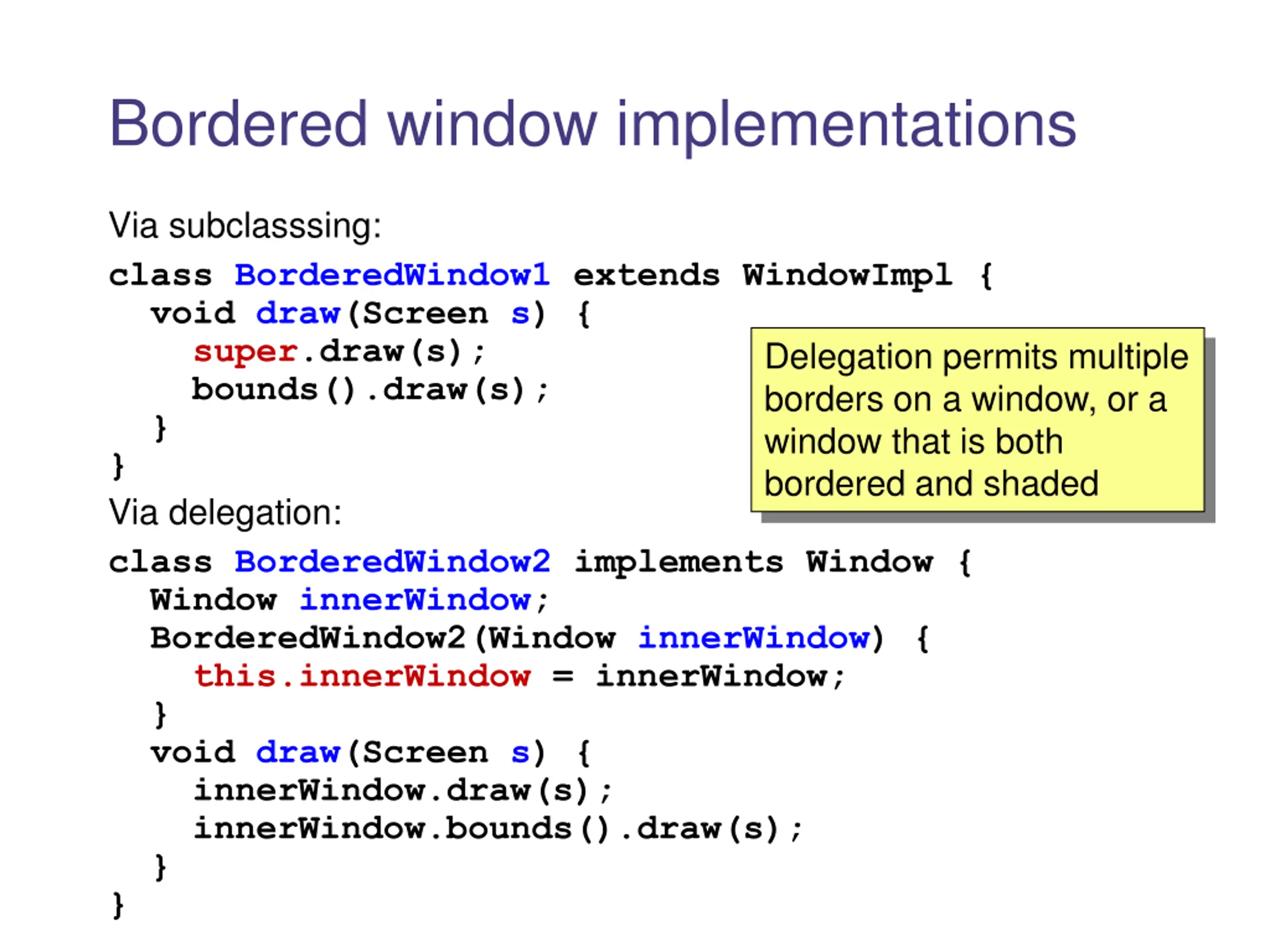 Bordered window implementations Via subclasssing: class BorderedWindow1 extends WindowImpl { void draw(Screen s) { super.draw(s); bounds().draw(s); } } Via delegation: class BorderedWindow2 implements Window { Window innerWindow; BorderedWindow2(Window innerWindow) { this.innerWindow = innerWindow; } void draw(Screen s) { innerWindow.draw(s); innerWindow.bounds().draw(s); } } Delegation permits multiple borders on a window, or a window that is both bordered and shaded