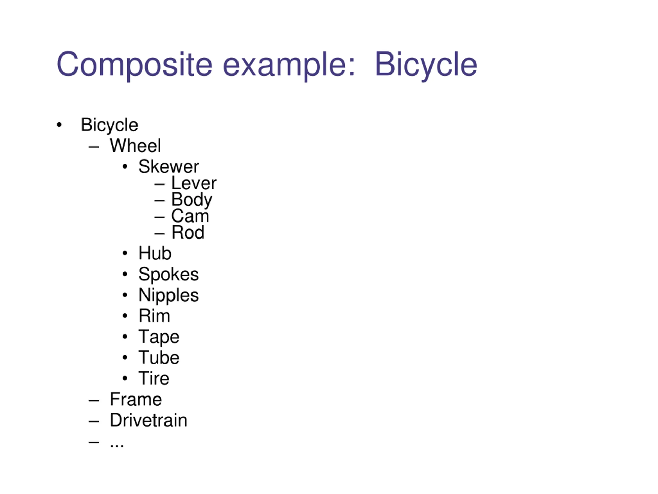 Composite example: Bicycle Bicycle Wheel Skewer Lever Body Cam Rod Hub Spokes Nipples Rim Tape Tube Tire Frame Drivetrain ...
