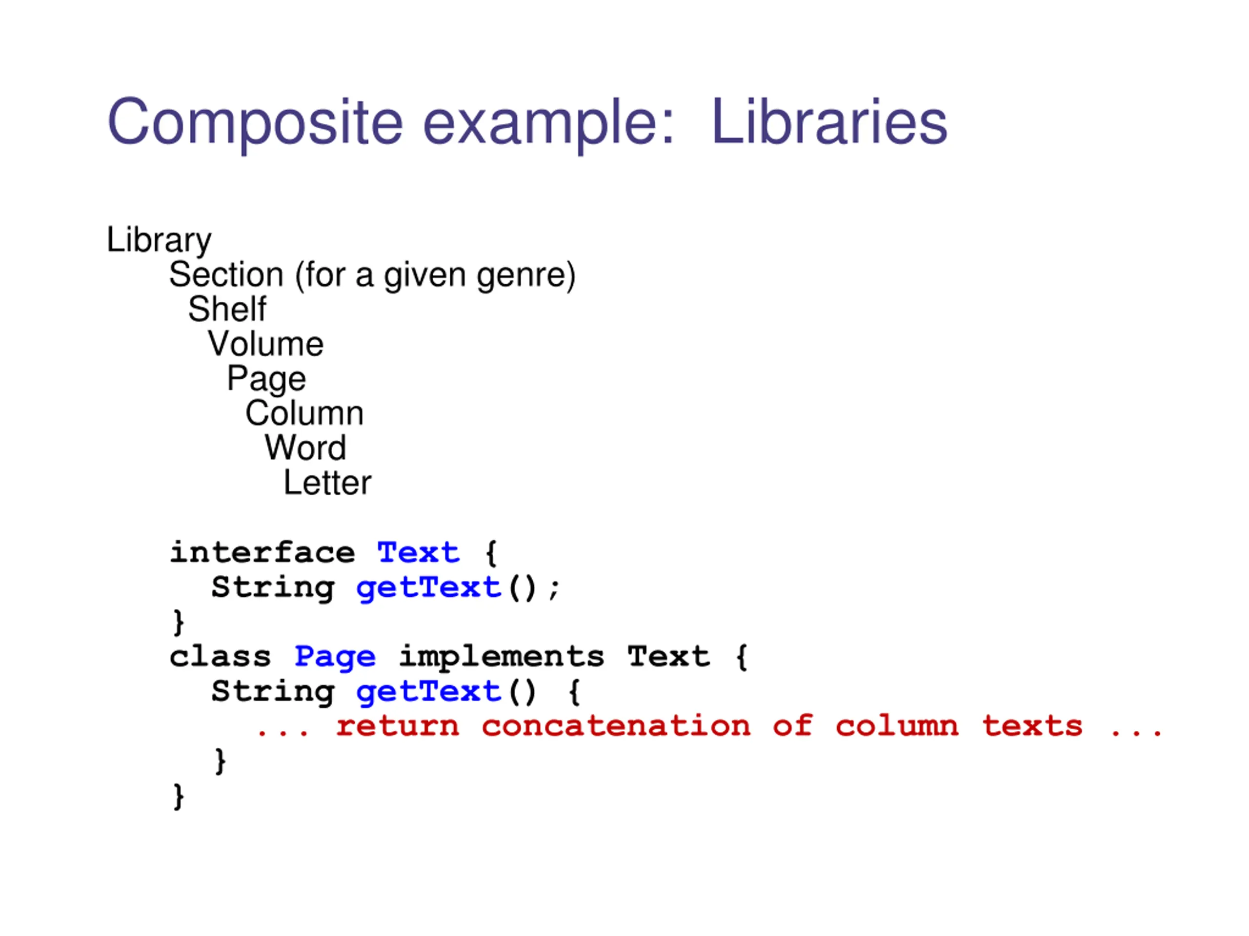 Composite example: Libraries Library Section (for a given genre) Shelf Volume Page Column Word Letter interface Text { String getText(); } class Page implements Text { String getText() { ... return concatenation of column texts ... } }