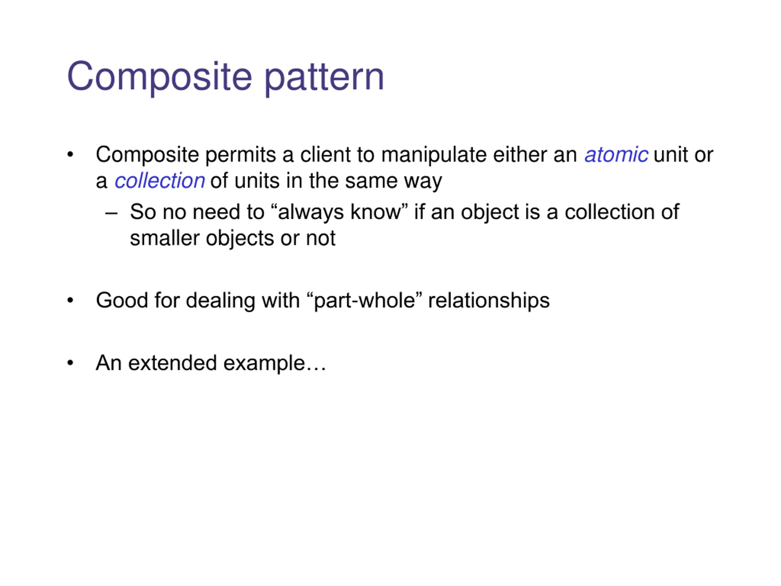 Composite pattern Composite permits a client to manipulate either an atomic unit or a collection of units in the same way So no need to always know if an object is a collection of smaller objects or not Good for dealing with part-whole relationships An extended example