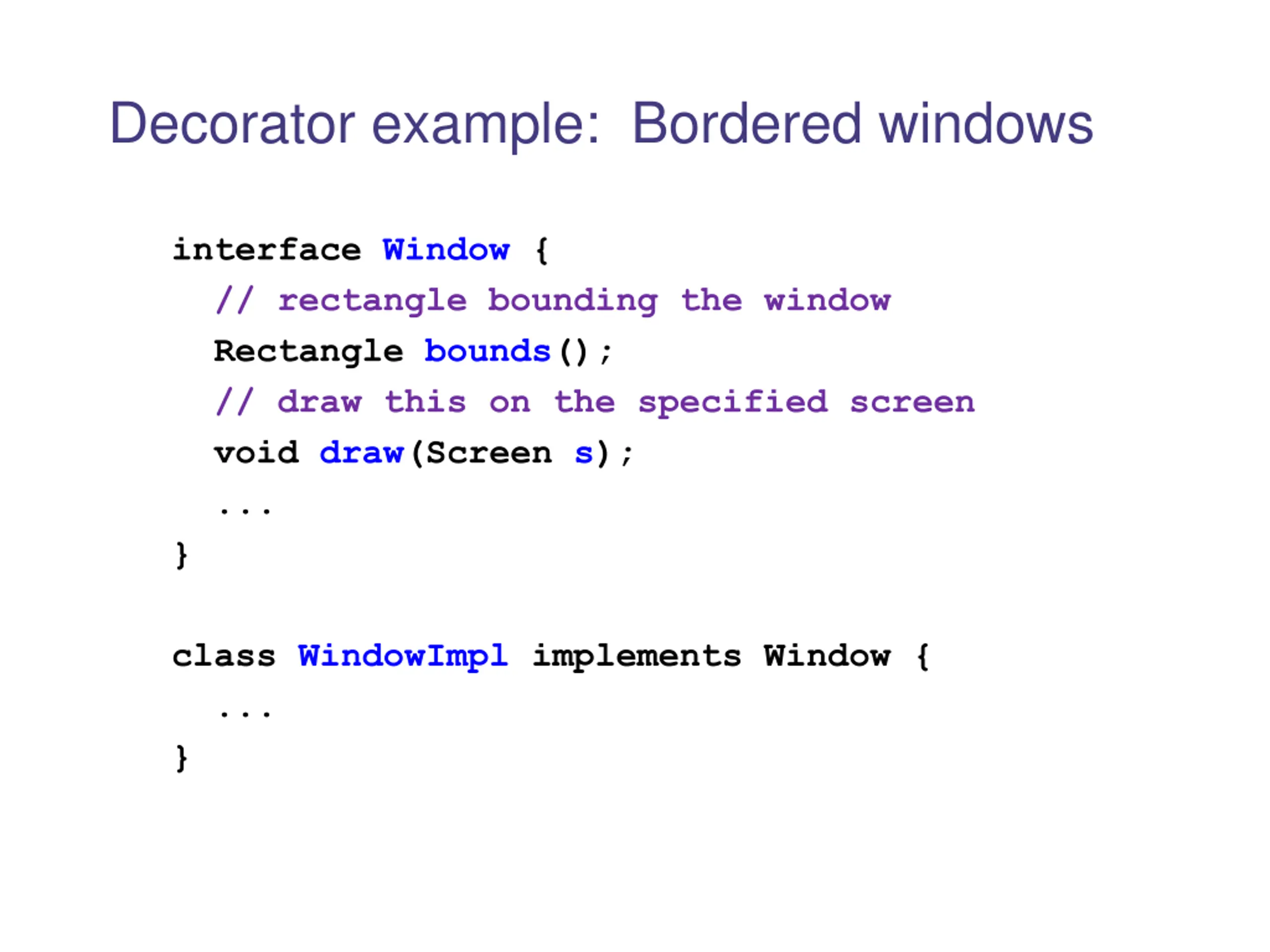 Decorator example: Bordered windows interface Window { // rectangle bounding the window Rectangle bounds(); // draw this on the specified screen void draw(Screen s); ... } class WindowImpl implements Window { ... }
