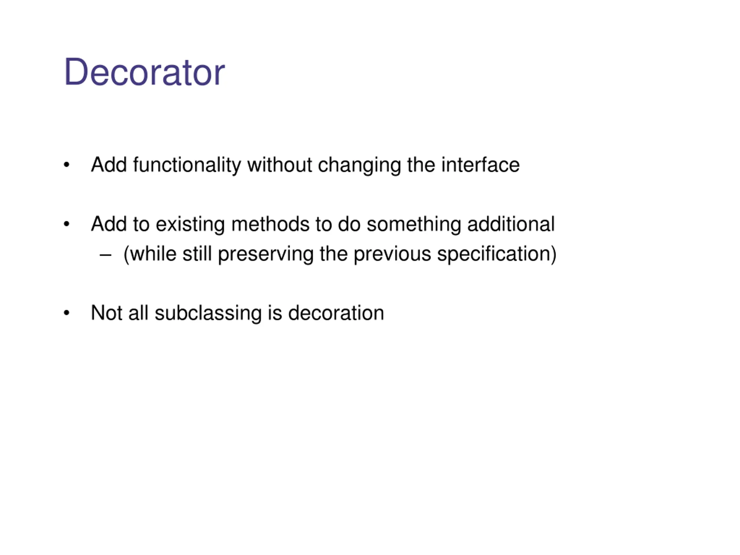Decorator Add functionality without changing the interface Add to existing methods to do something additional (while still preserving the previous specification) Not all subclassing is decoration