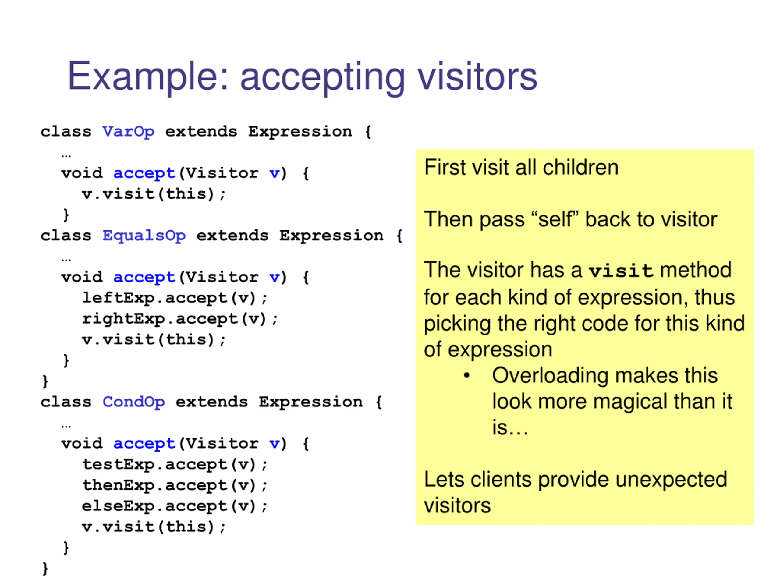 Example: accepting visitors class VarOp extends Expression { void accept(Visitor v) { v.visit(this); } class EqualsOp extends Expression { void accept(Visitor v) { leftExp.accept(v); rightExp.accept(v); v.visit(this); } } class CondOp extends Expression { void accept(Visitor v) { testExp.accept(v); thenExp.accept(v); elseExp.accept(v); v.visit(this); } } First visit all children Then pass self back to visitor The visitor has a visit method for each kind of expression, thus picking the right code for this kind of expression Overloading makes this look more magical than it is Lets clients provide unexpected visitors