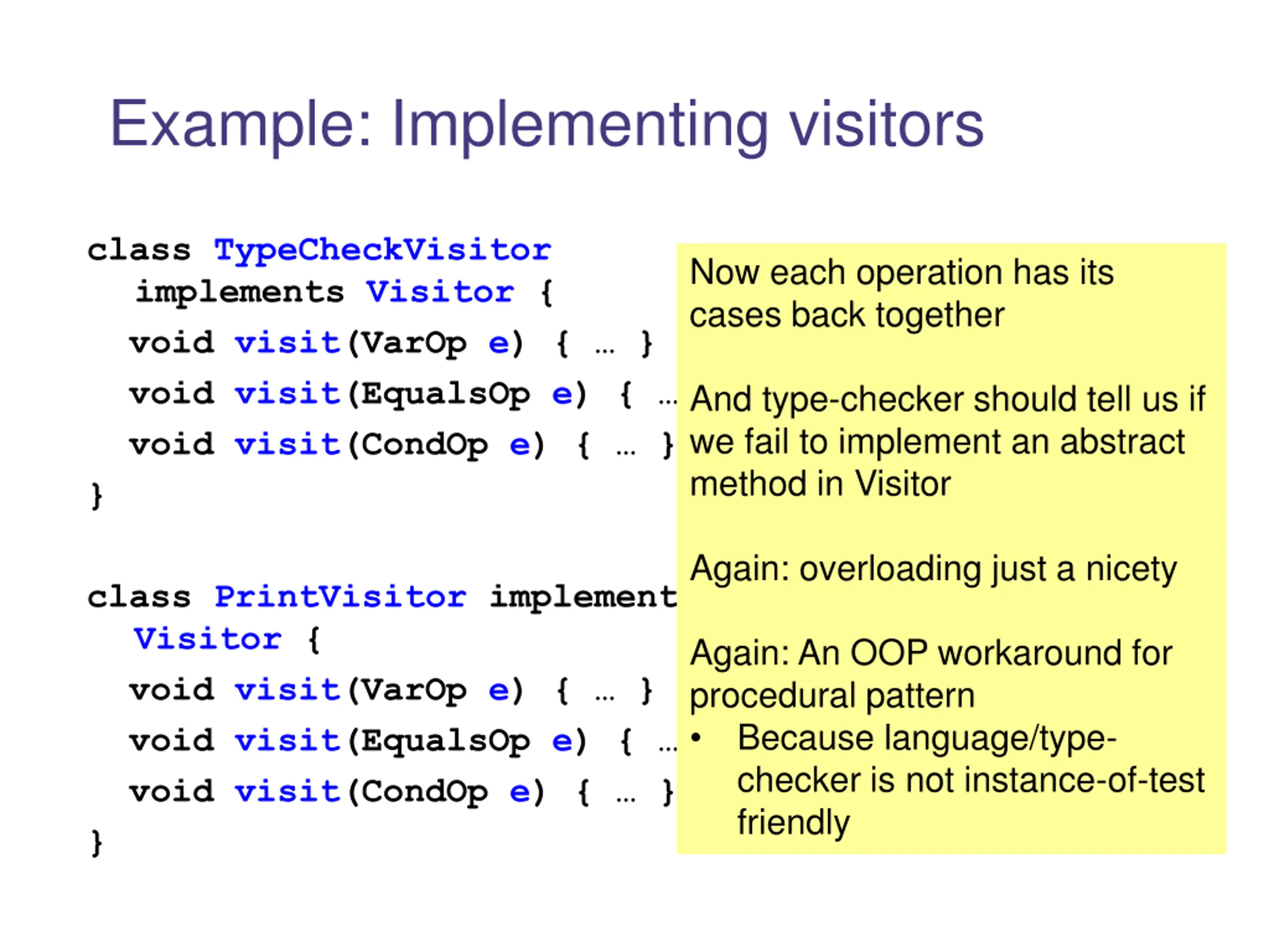 Example: Implementing visitors class TypeCheckVisitor implements Visitor { void visit(VarOp e) { } void visit(EqualsOp e) { } void visit(CondOp e) { } } Now each operation has its cases back together And type-checker should tell us if we fail to implement an abstract method in Visitor Again: overloading just a nicety class PrintVisitor implements Visitor { void visit(VarOp e) { } void visit(EqualsOp e) { } void visit(CondOp e) { } } Again: An OOP workaround for procedural pattern Because language/type- checker is not instance-of-test friendly