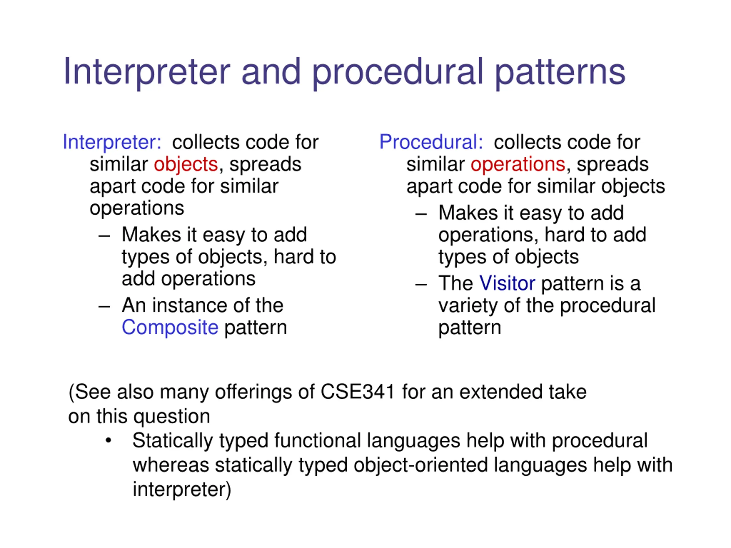 Interpreter and procedural patterns Interpreter: collects code for similar objects, spreads apart code for similar operations Makes it easy to add types of objects, hard to add operations An instance of the Composite pattern Procedural: collects code for similar operations, spreads apart code for similar objects Makes it easy to add operations, hard to add types of objects The Visitor pattern is a variety of the procedural pattern (See also many offerings of CSE341 for an extended take on this question Statically typed functional languages help with procedural whereas statically typed object-oriented languages help with interpreter)
