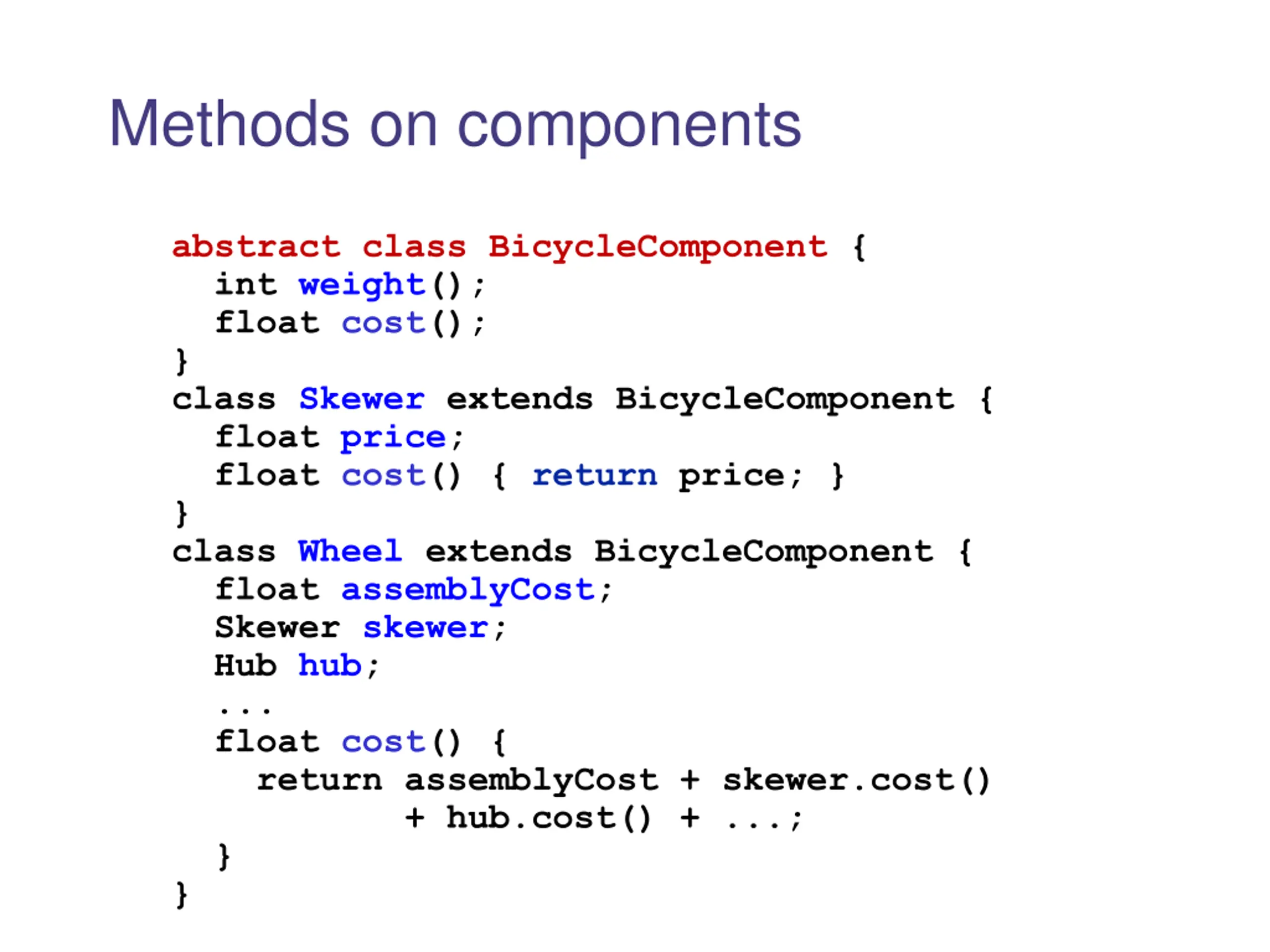 Methods on components abstract class BicycleComponent { int weight(); float cost(); } class Skewer extends BicycleComponent { float price; float cost() { return price; } } class Wheel extends BicycleComponent { float assemblyCost; Skewer skewer; Hub hub; ... float cost() { return assemblyCost + skewer.cost() + hub.cost() + ...; } }