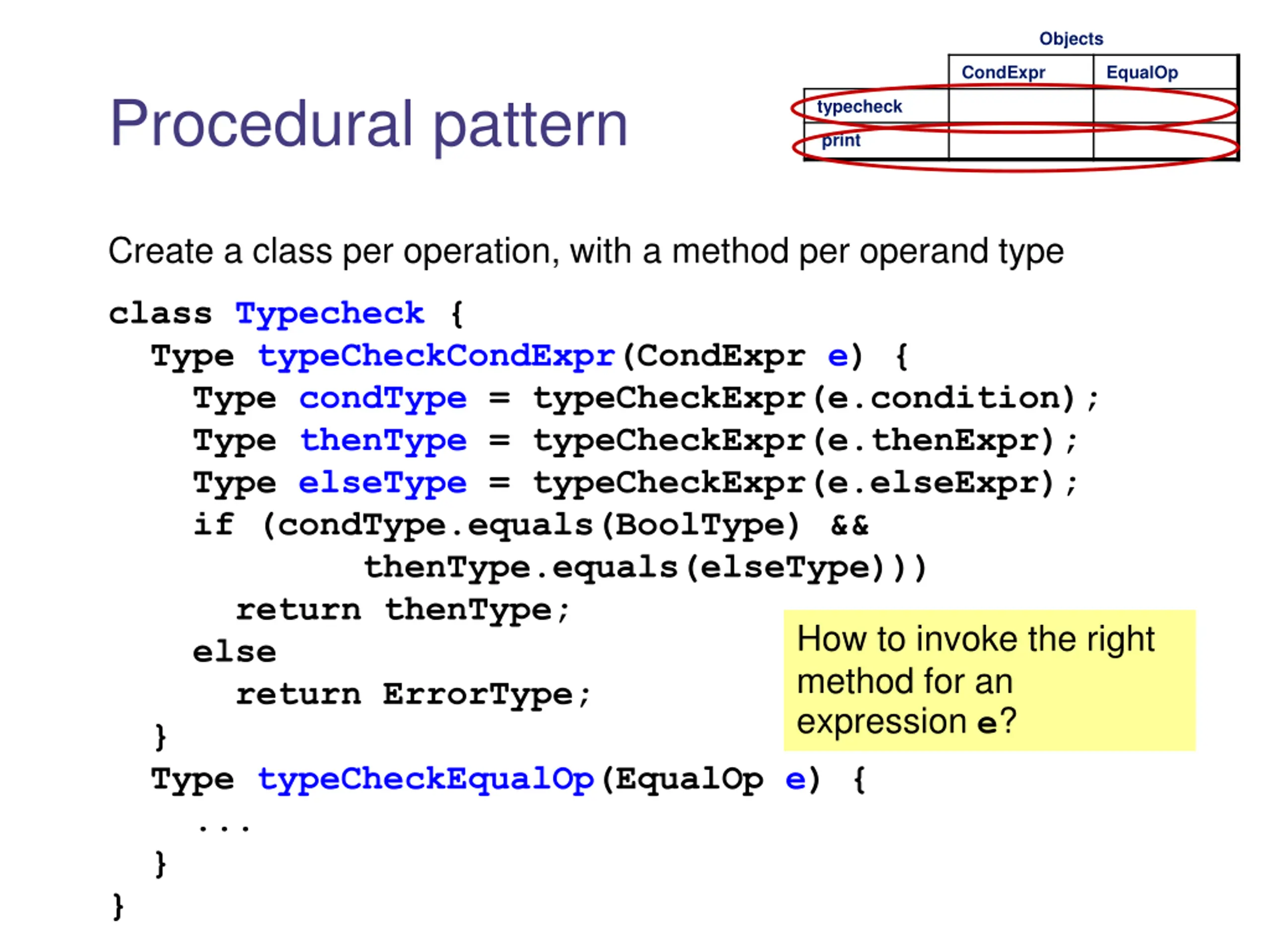 Objects CondExpr EqualOp Procedural pattern typecheck print Create a class per operation, with a method per operand type class Typecheck { Type typeCheckCondExpr(CondExpr e) { Type condType = typeCheckExpr(e.condition); Type thenType = typeCheckExpr(e.thenExpr); Type elseType = typeCheckExpr(e.elseExpr); if (condType.equals(BoolType) && thenType.equals(elseType))) return thenType; else return ErrorType; } Type typeCheckEqualOp(EqualOp e) { ... } } How to invoke the right method for an expression e?
