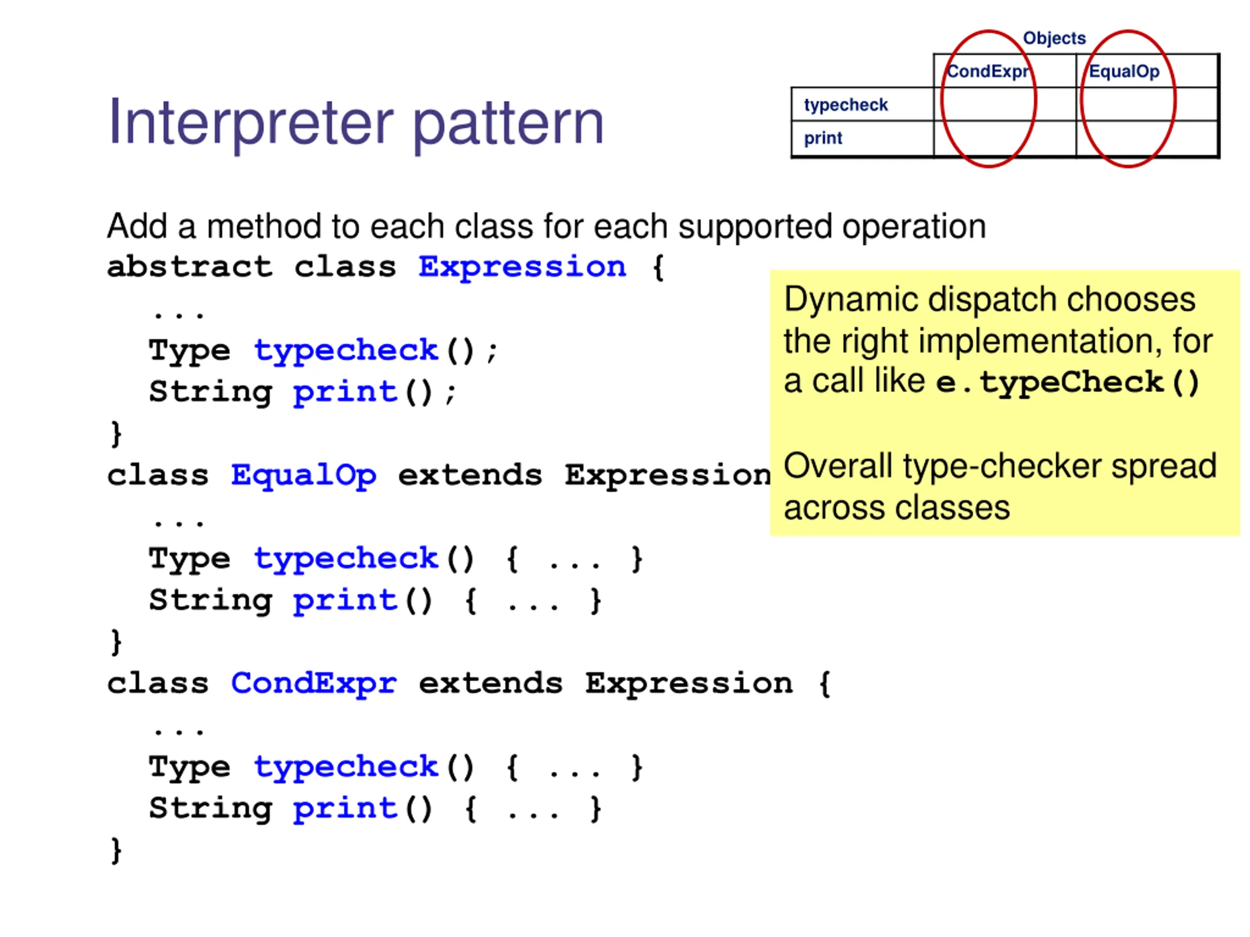Objects CondExpr EqualOp Interpreter pattern typecheck print Add a method to each class for each supported operation abstract class Expression { ... Type typecheck(); String print(); } class EqualOp extends Expression { ... Type typecheck() { ... } String print() { ... } } class CondExpr extends Expression { ... Type typecheck() { ... } String print() { ... } } Dynamic dispatch chooses the right implementation, for a call like e.typeCheck() Overall type-checker spread across classes