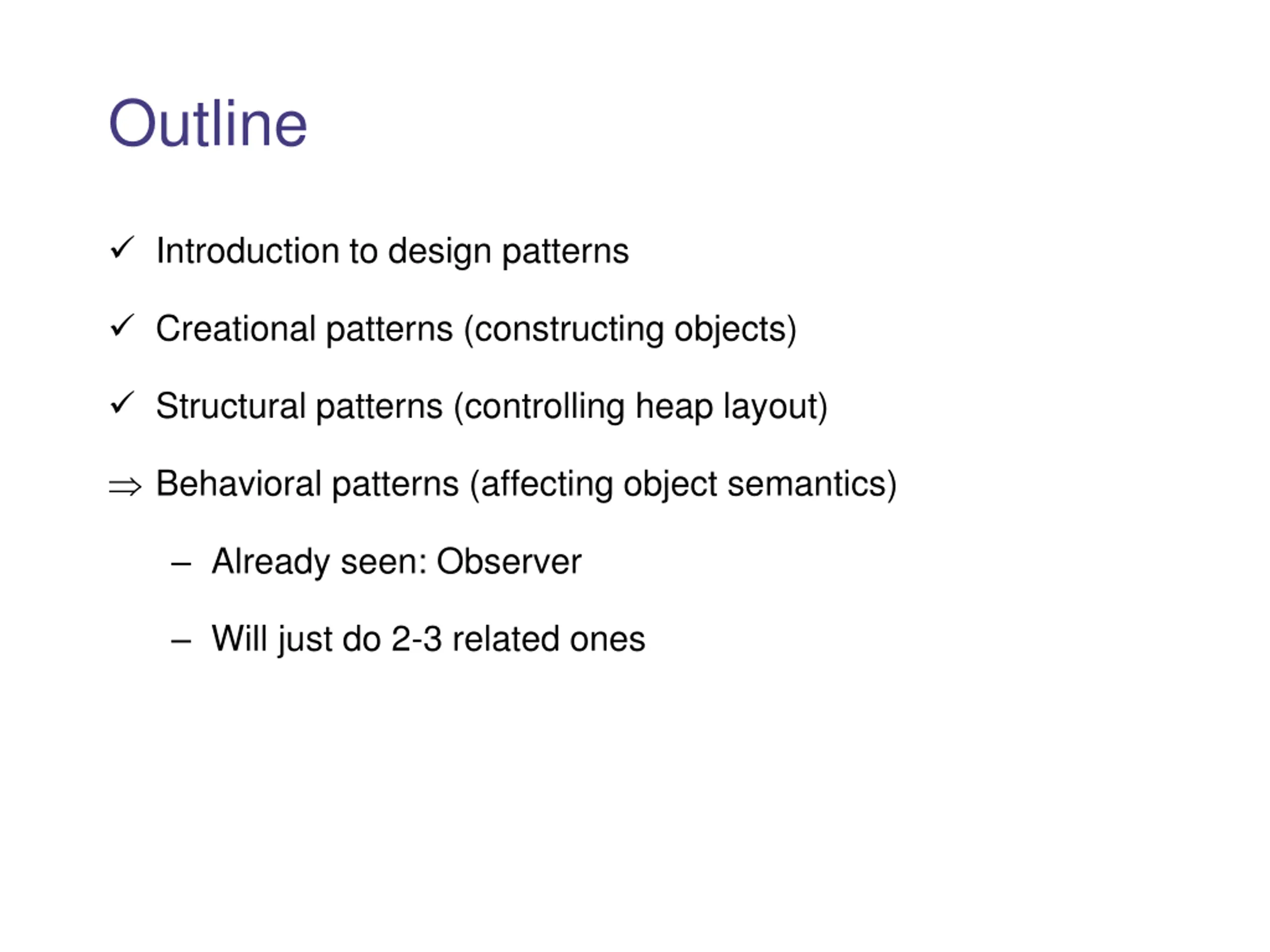 Outline Introduction to design patterns Creational patterns (constructing objects) Structural patterns (controlling heap layout) Behavioral patterns (affecting object semantics) Already seen: Observer Will just do 2-3 related ones