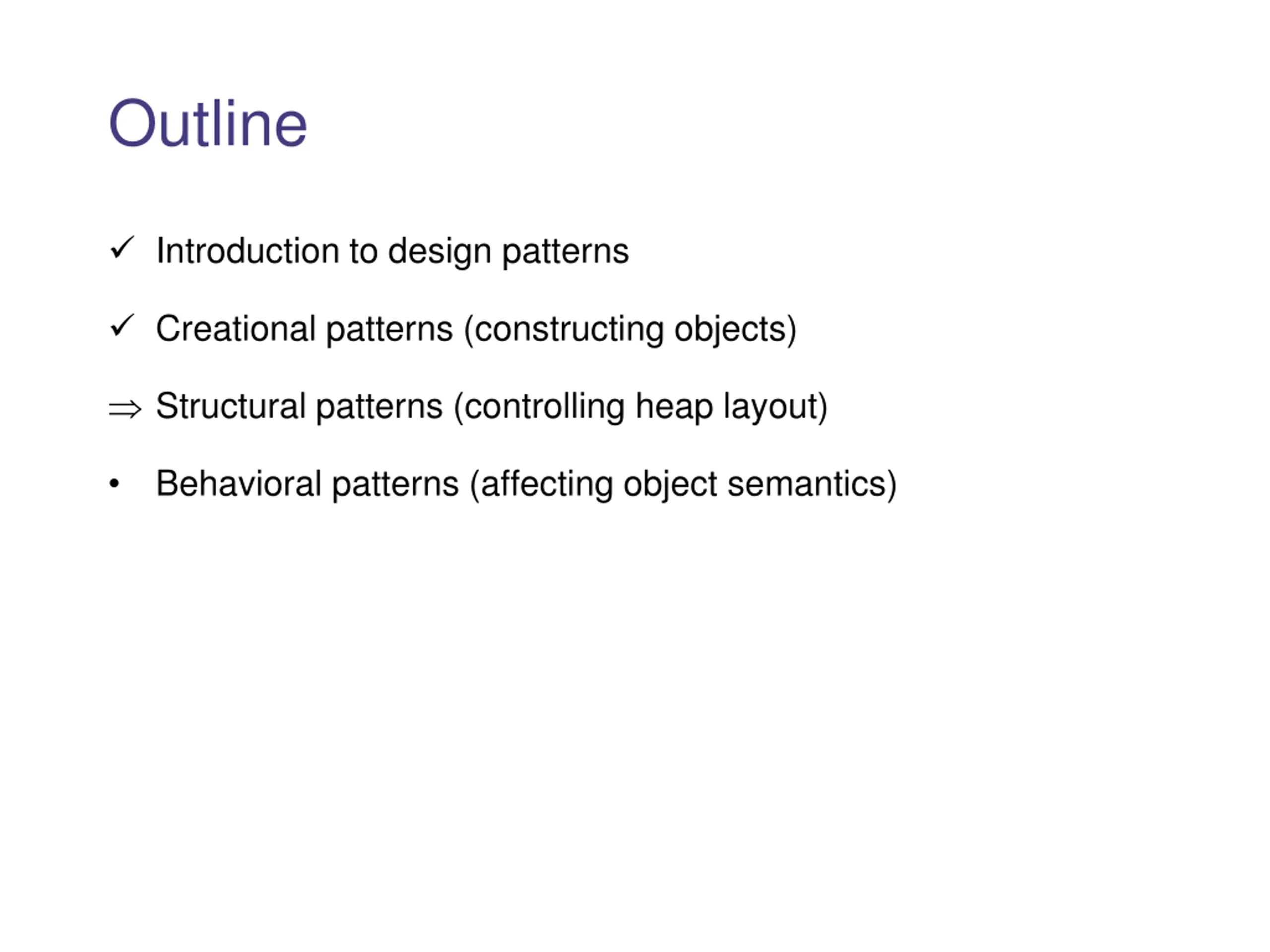 Outline Introduction to design patterns Creational patterns (constructing objects) Structural patterns (controlling heap layout) Behavioral patterns (affecting object semantics)